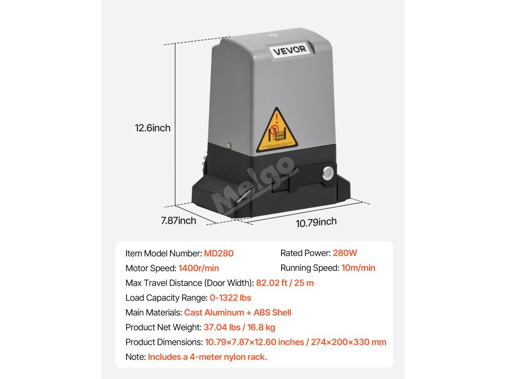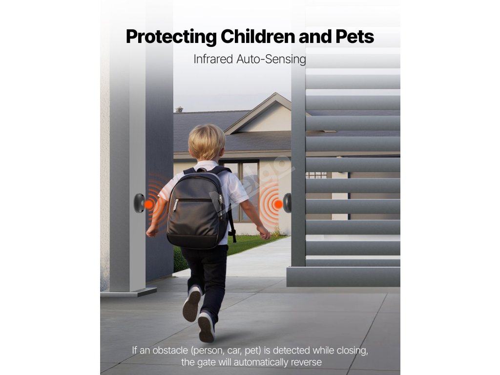 Tento otvírač bran je vybaven 280W motorem z čisté mědi, který si poradí s branami o šířce až 82,02 ft/25 m a hmotnosti 1799 lbs/816 kg, přičemž nabízí plynulý a rychlý provoz (10 m/min), který šetří váš čas. Díky infračervené technologii automatického rozpoznávání brány zabraňuje kolizím, čímž zajišťuje bezpečnost vaší rodiny a domácích mazlíčků.