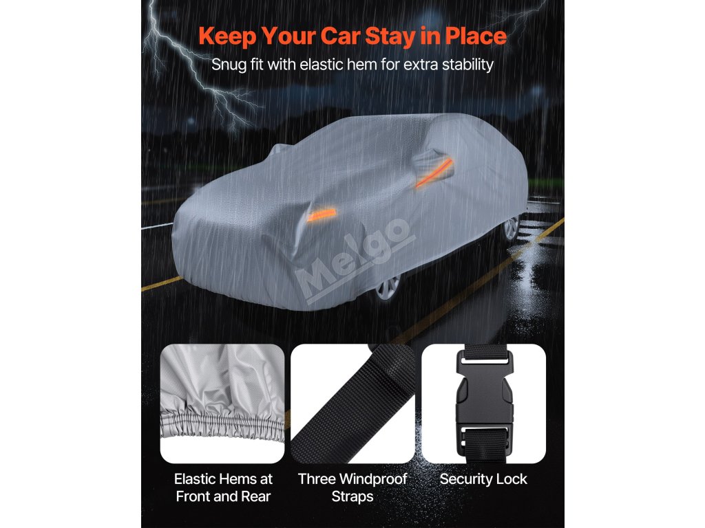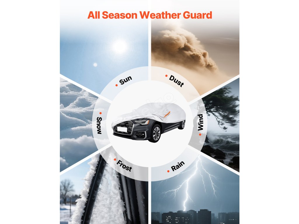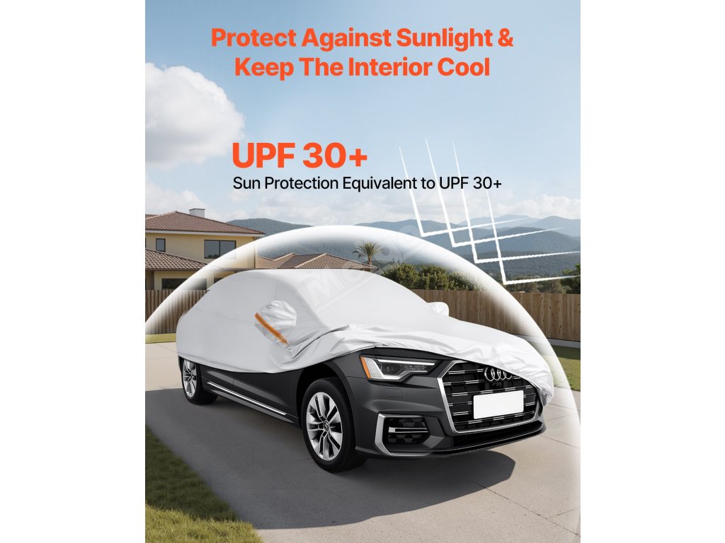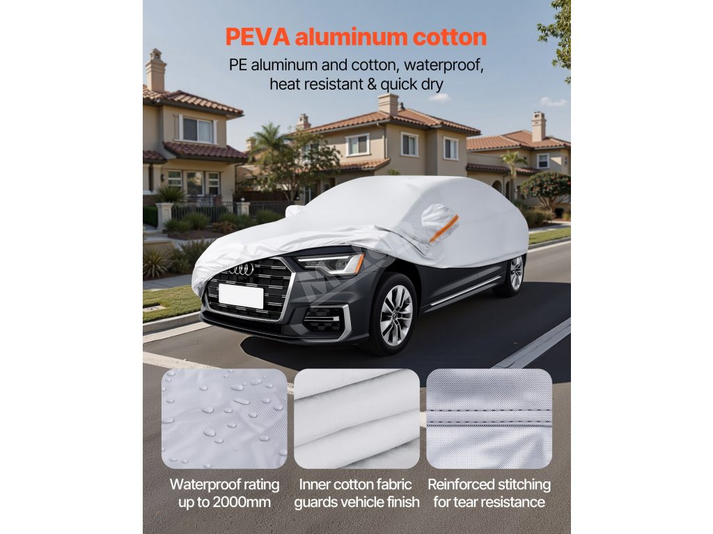 Potah na auto VEVOR je potažen nepromokavou vrstvou, takže je ideální do deštivého nebo zasněženého počasí. Stříbrná vrstva UV30+ blokuje škodlivé sluneční záření a poskytuje tak skvělou ochranu před sluncem. Skvělé řešení pro ochranu vašeho vozidla za každého počasí.