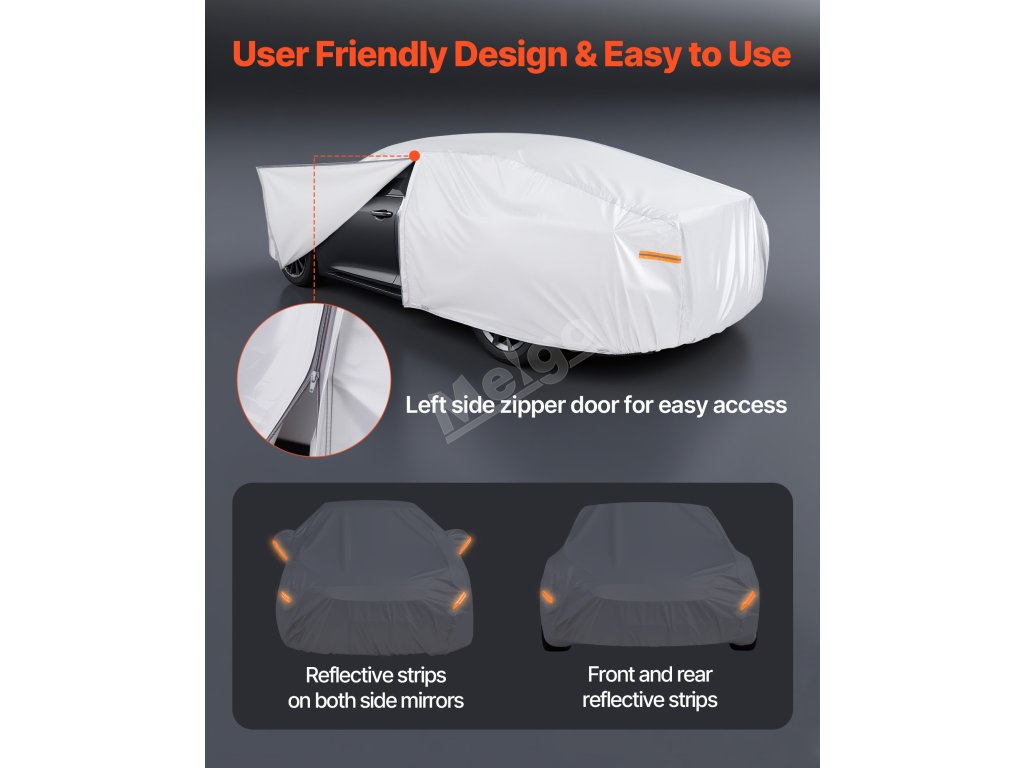 Tento nepromokavý potah na auto s praktickým zipem na levé straně zajišťuje snadný přístup do vozidla. Šest reflexních proužků zvyšuje viditelnost v noci, takže je pro vás i vaše vozidlo bezpečnější. Dokonalá kombinace promyšleného designu a bezpečnosti pro každodenní jízdu.