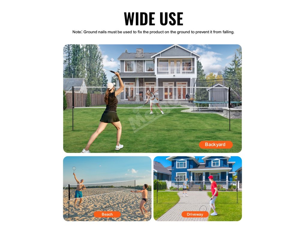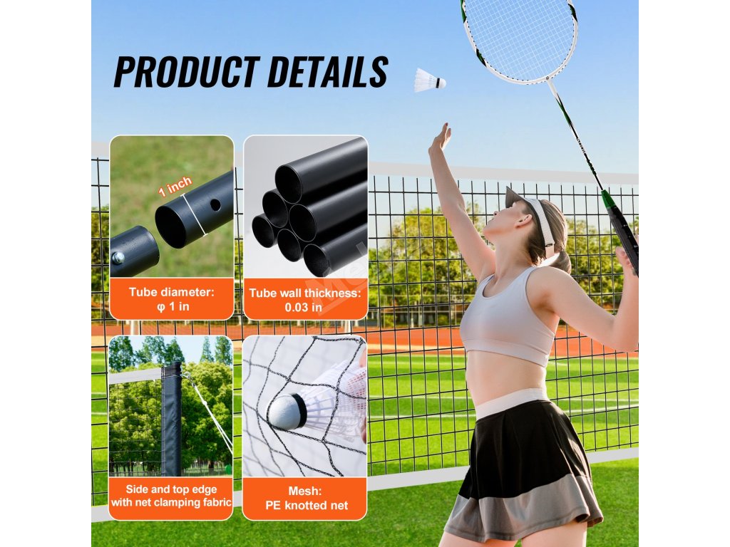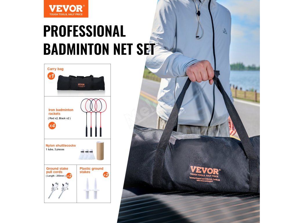 Bohaté příslušenství, včetně: 1 x badmintonová síť; několik vylepšených práškově lakovaných tyčí; 4 x badmintonové rakety; 3 x nylonové raketky; 1 x odolná taška 600D Oxford. Tato sada badmintonové sítě se snadno skladuje a přepravuje.