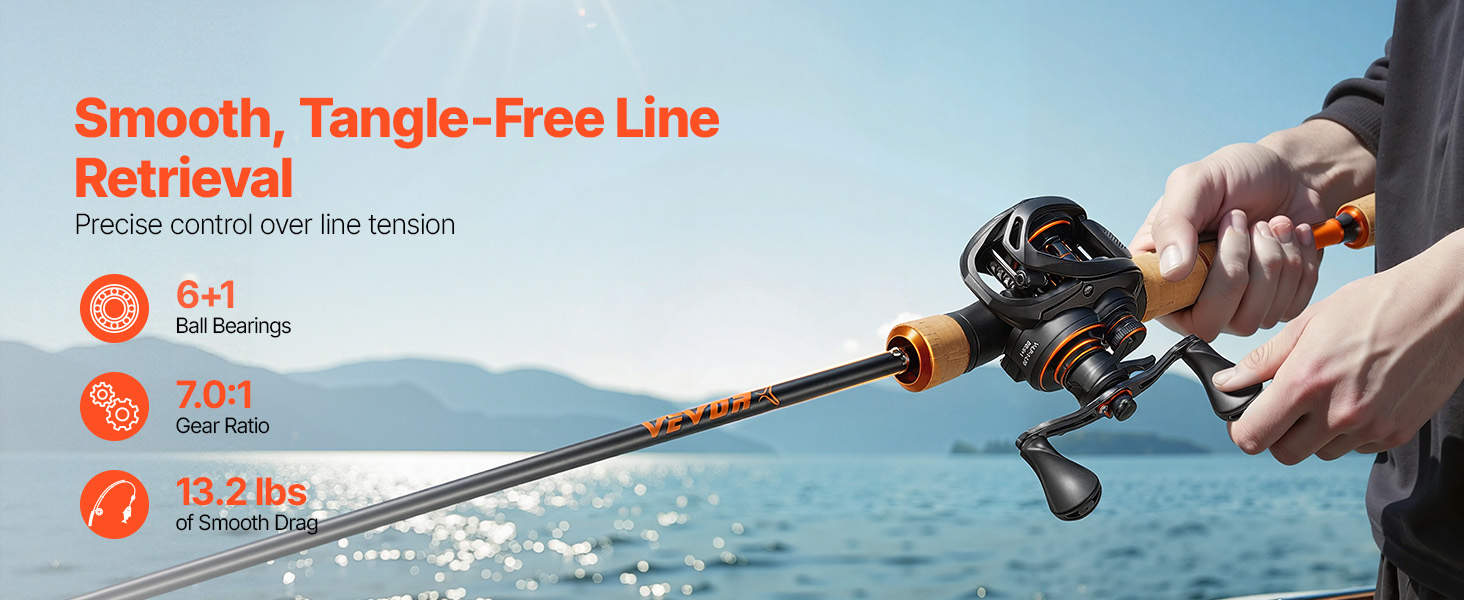 Díky 6+1 kuličkovým ložiskům a převodovému poměru 7,0:1 zajišťuje tento rybářský prut a naviják plynulé a účinné navíjení vlasce bez přerušení. Brzdná síla 13,2 lbs/6 kg umožňuje přesnou kontrolu napětí vlasce, takže snadno zvládnete intenzivní souboje s rybami a snadno nahodíte háček.