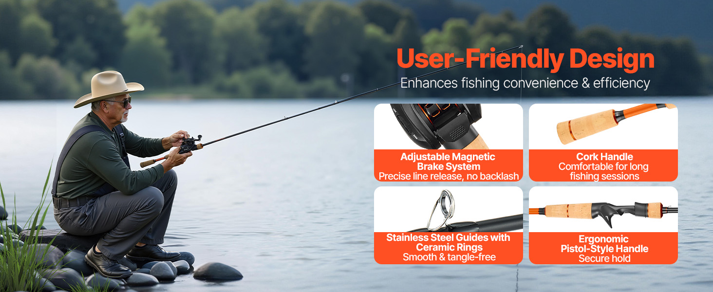 Tato rybářská sada je vybavena nastavitelným magnetickým systémem brzdy pro přesné uvolnění vlasce, který snižuje zpětný ráz. Korková rukojeť poskytuje pohodlné, neklouzavé držení i při dlouhodobém používání, zatímco keramická vodicí očka minimalizují tření vlasce a zabraňují jeho zamotávání, čímž zajišťují hladký a efektivní provoz.
