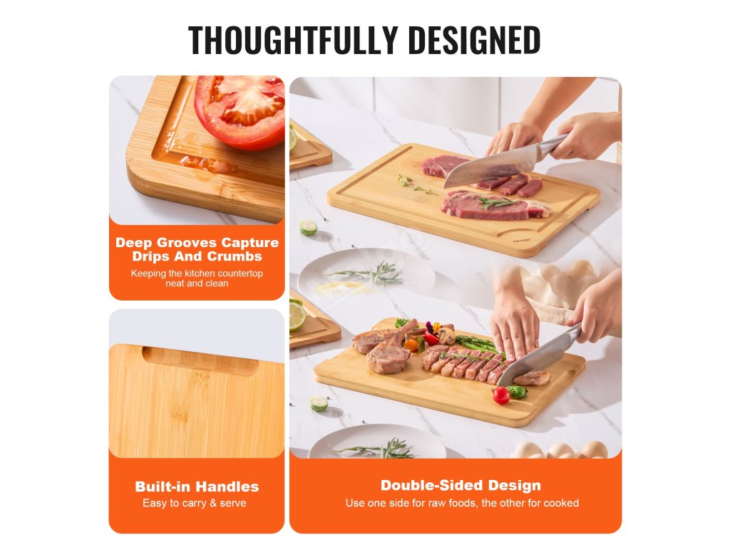 Při práci s menším množstvím surovin můžete použít pouze jednu desku. Jedna strana je vybavena drážkou na šťávu pro syrové potraviny, zatímco druhá je ideální pro vařené produkty. Může také sloužit jako přípravné prkénko a druhá strana pro krájení a servírování.