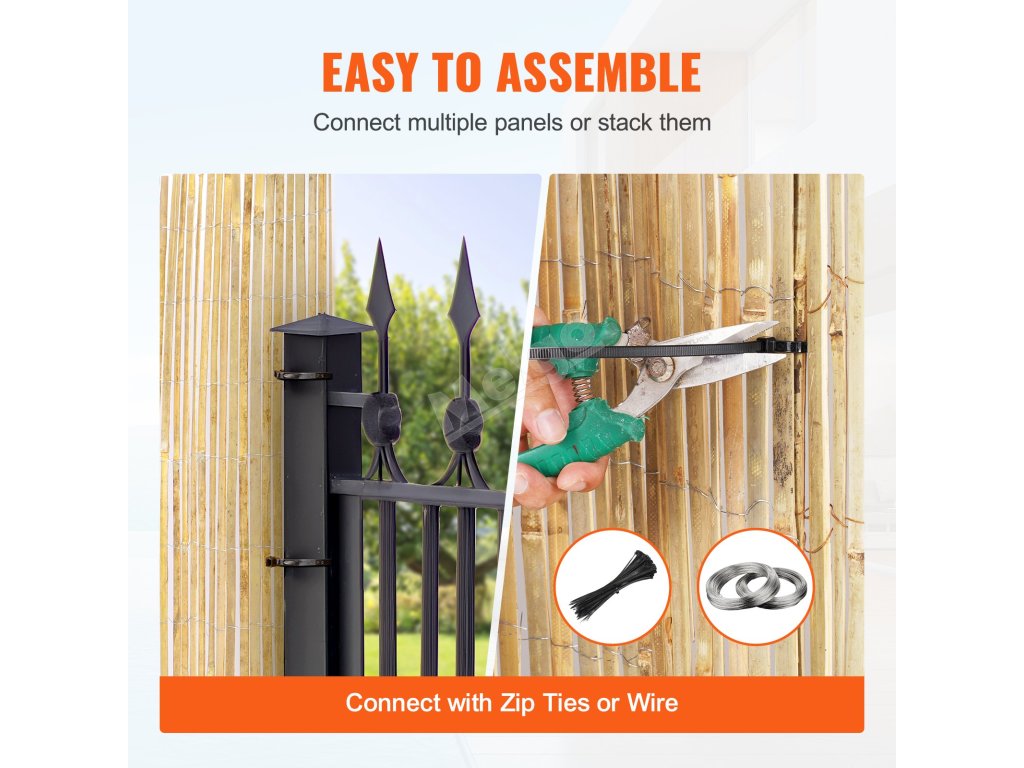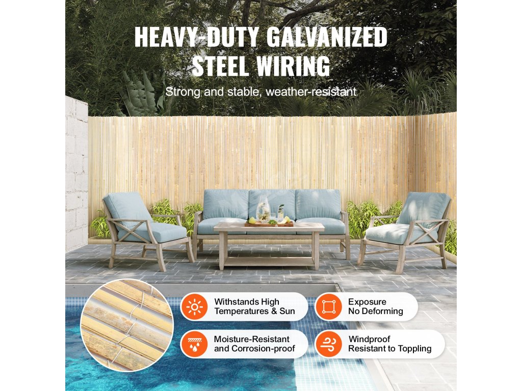 Tato bambusová zábrana je vyrobena z přírodních materiálů a pečlivě ručně vyrobena a má zesílené bambusové lamely pro větší pevnost. Husté spoje z ocelového drátu zajišťují stabilitu a odolnost i ve větrných a deštivých dnech.