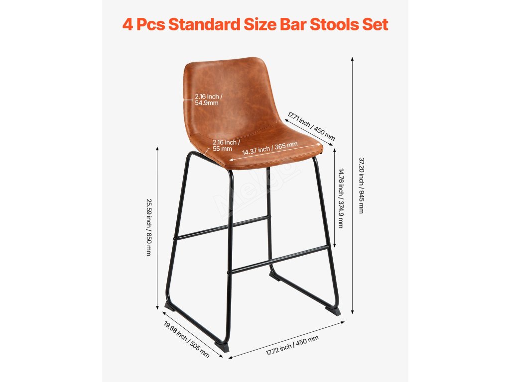Barové židle sada 4, 65 cm, pu kůže, opěrka, kovové nohy, hnědé