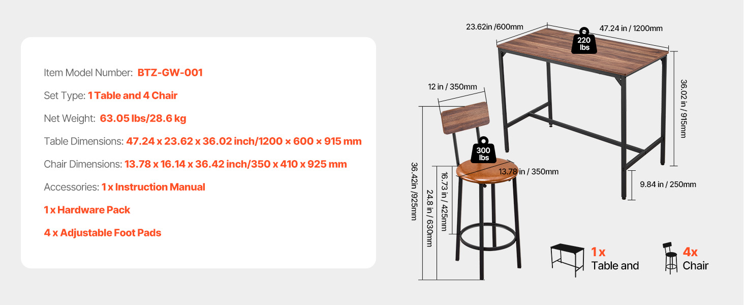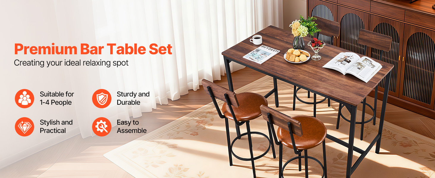 Tento prémiový obdélníkový barový stůl se židlí je speciálně navržen pro 1 až 4 osoby. Díky své robustní a odolné konstrukci kombinuje stylový vzhled s praktičností. Snadno se instaluje a umožňuje vám rychle vytvořit dokonalý prostor pro odpočinek a zábavu.