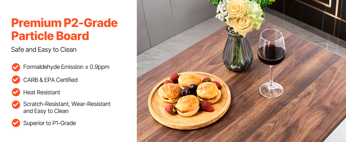 Náš kuchyňský stůl a barové židle mají desku z dřevotřísky třídy P2, která je spolehlivá a snadno se čistí, s přísně kontrolovanými emisemi formaldehydu ≤ 0,9 ppm. Je odolná vůči teplu a vodě a snadno se čistí, takže zůstává jako nová i po delším používání.