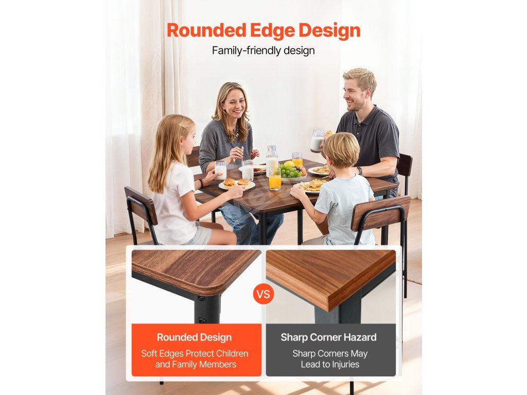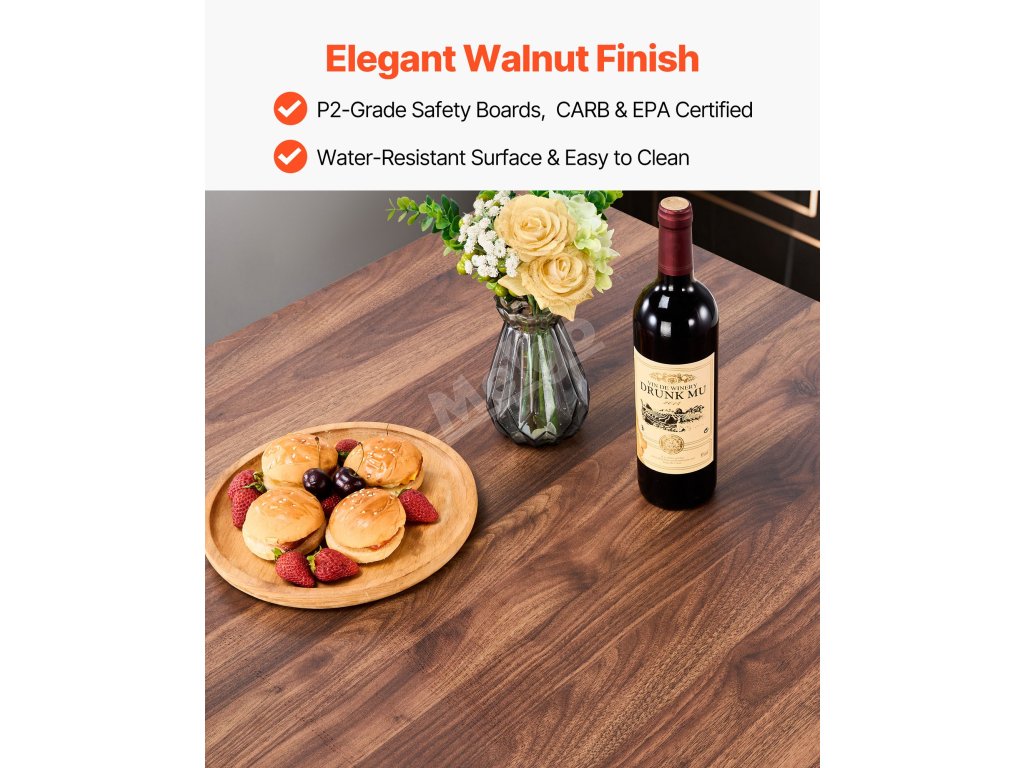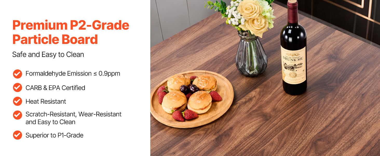 Náš kuchyňský stůl a barové židle mají desku z dřevotřískové desky třídy P2, která je spolehlivá a snadno se čistí, s přísně kontrolovanými emisemi formaldehydu ≤ 0,9 ppm. Je tepelně odolná, voděodolná a snadno se čistí, takže zůstává jako nová i po delším používání.