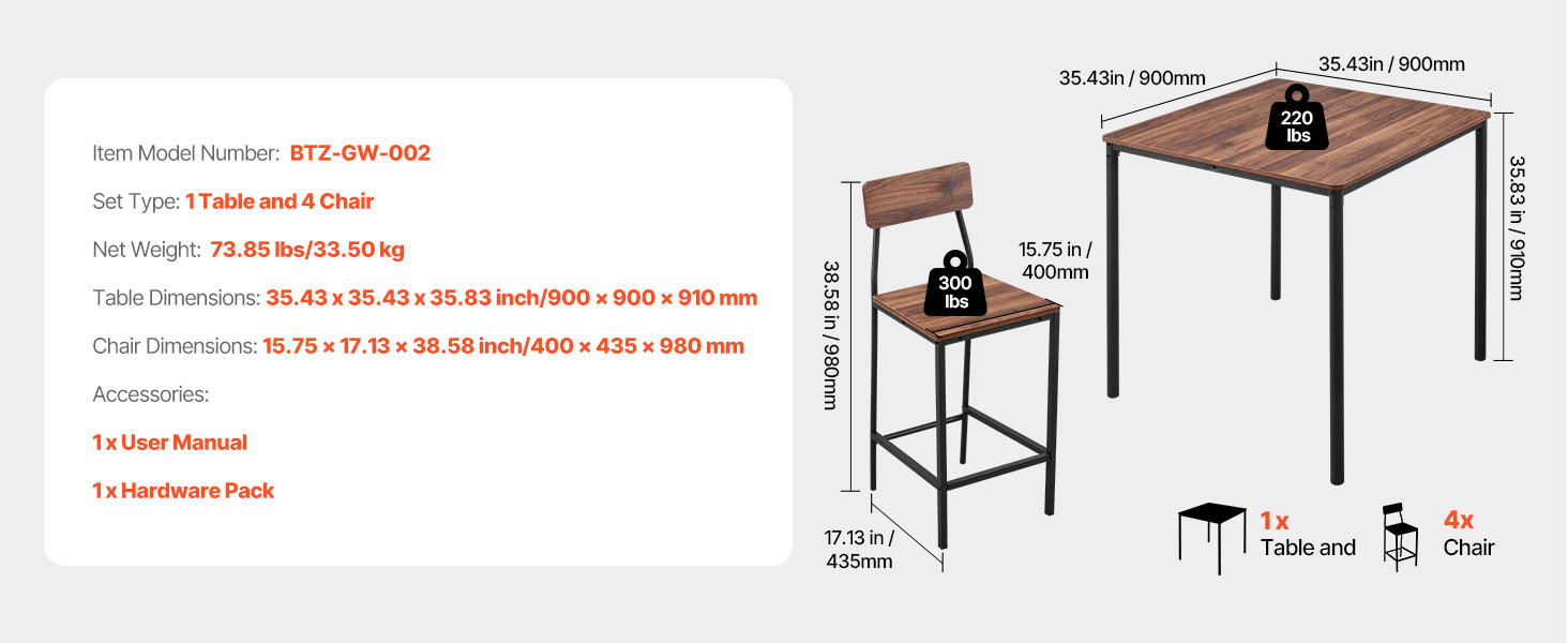 | Rozměry stolu | 35,43 x 35,43 x 35,83 palců/900 x 900 x 910 mm |
