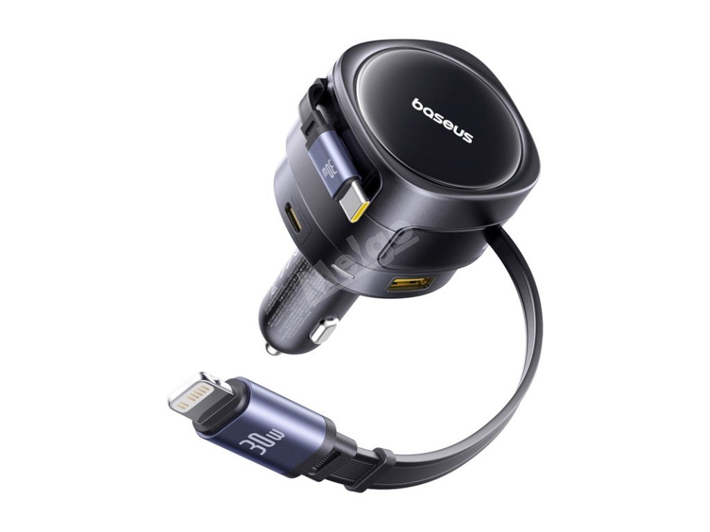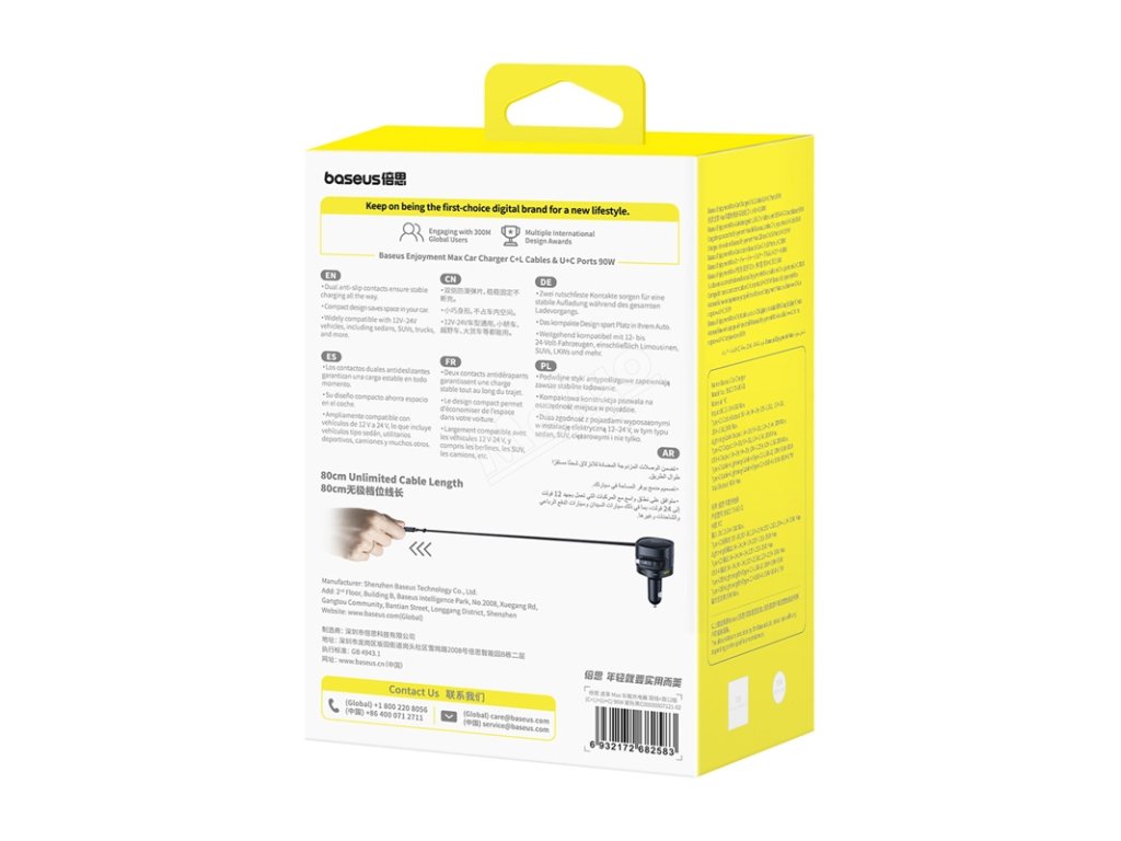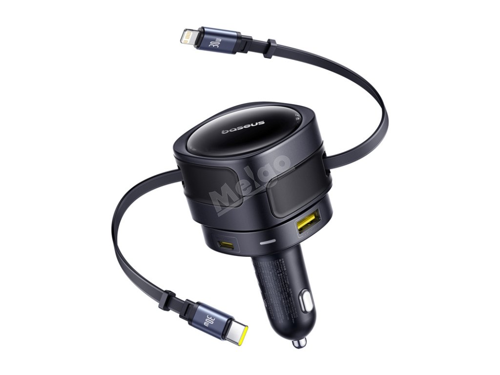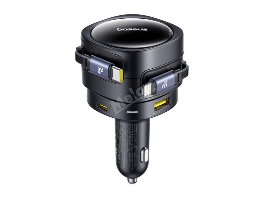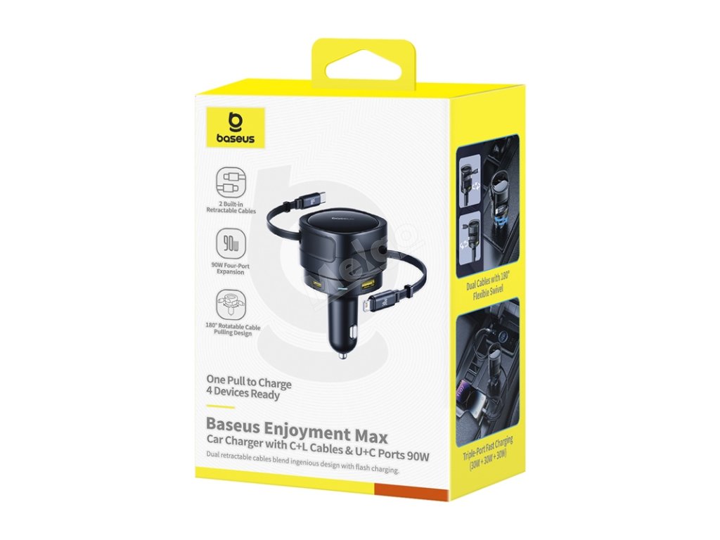 Díky dvěma vestavěným kabelům (USB-C a Lightning) a dvěma dalším portům (USB-C a USB-A) umožňuje autonabíječka Baseus nabíjet až čtyři zařízení najednou s celkovým výkonem až 90 W. Integrovaný bezpečnostní systém, otočná konstrukce a kompatibilita s napětím 12-24 V zaručují spolehlivost v každém vozidle.