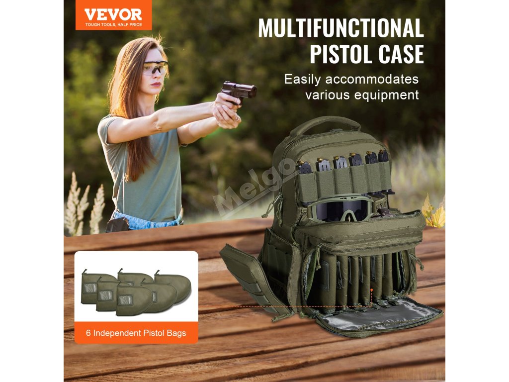 Střelecká brašna obsahuje 6 samostatných kapes na zbraně ve tvaru písmene D pro bezpečné uložení 6 pistolí. Dále má 10 samostatných přihrádek na zásobníky spolu se 3 předními přihrádkami, 2 bočními kapsami a držákem na láhev s vodou pro předměty, jako je ochrana sluchu, brýle, svítilna, rukavice a další.