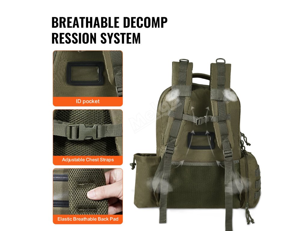 Prostorná hlavní přihrádka je vybavena 6 samostatnými kapsami na zbraně ve tvaru písmene D, které umožňují bezpečné uložení 6 pistolí různých velikostí. Přední kapsa je speciálně navržena pro uložení 6 zásobníků, což usnadňuje rychlý přístup k nim během lovu.