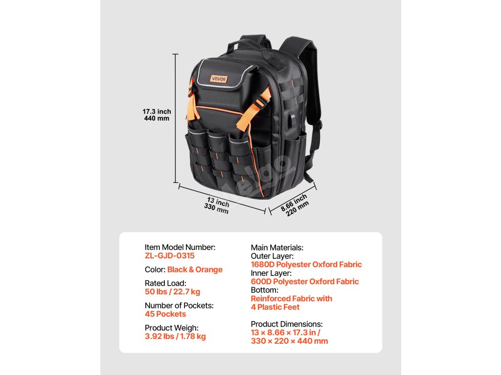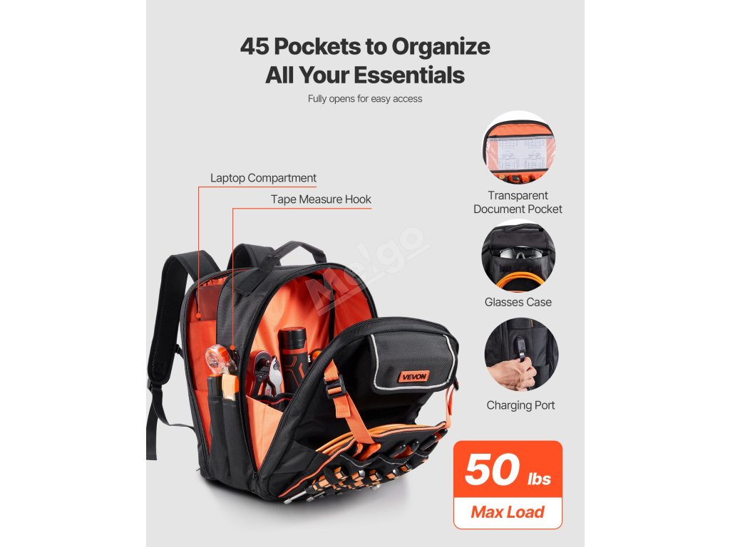 Odolný batoh na nářadí s nabíjecím portem: 45 kapes pro maximální úložný prostor