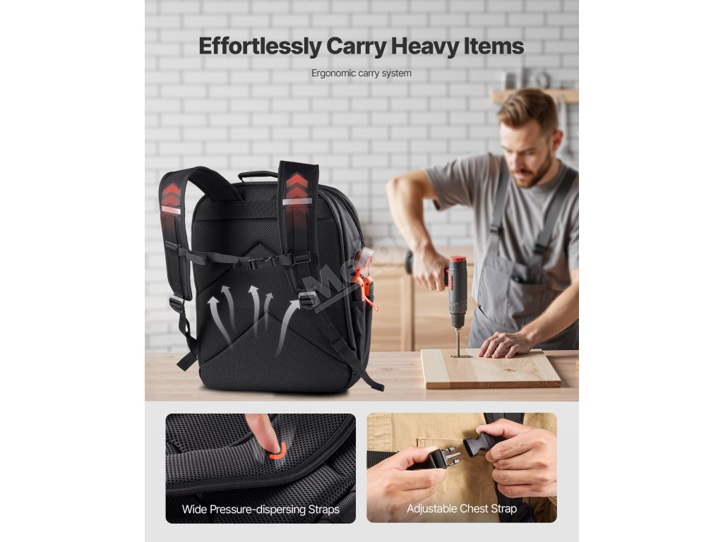 Tento těžký batoh na nářadí unese až 50 kg a podporuje režim nošení v ruce i v batohu. Díky pohodlnému systému nošení máte volné ruce, takže se můžete volně pohybovat a zároveň přenášet veškeré nářadí.