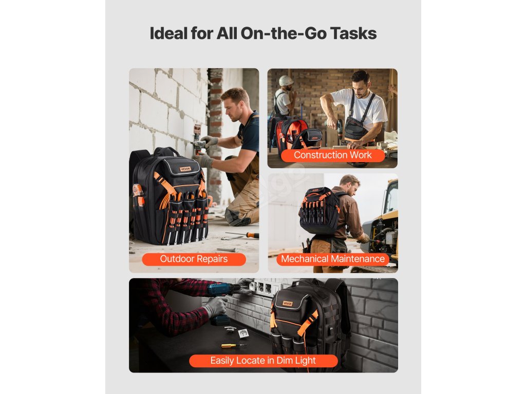 Tento batoh pro elektrikáře na staveništi je vyroben z odolné tkaniny 1680D Oxford a je odolný proti roztržení a opotřebení. Dvouhlavý zip byl testován více než 20 000krát a vyztužená základna se 4 opěrnými nožkami zajišťuje stabilitu, takže se batoh nepřevrátí.