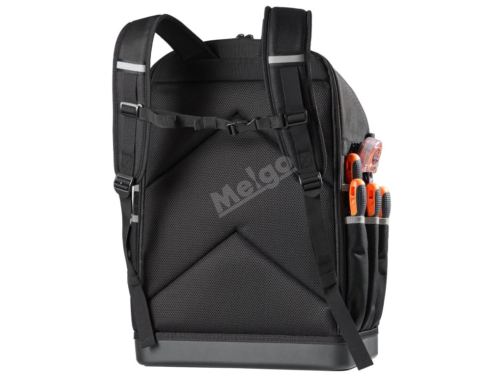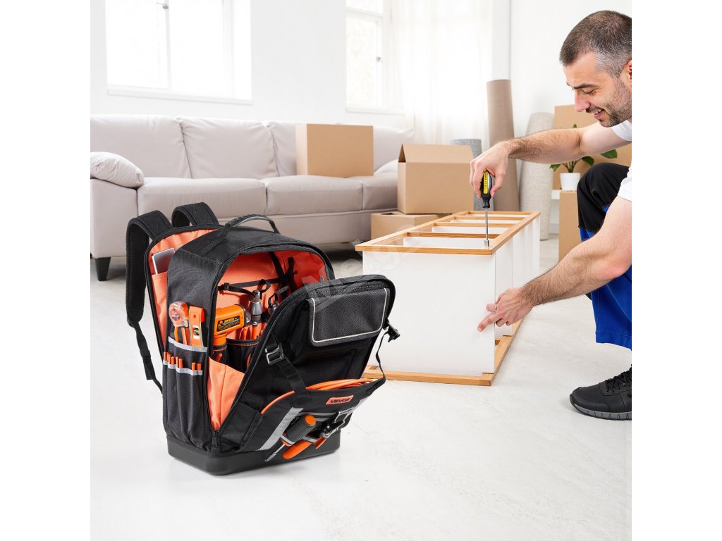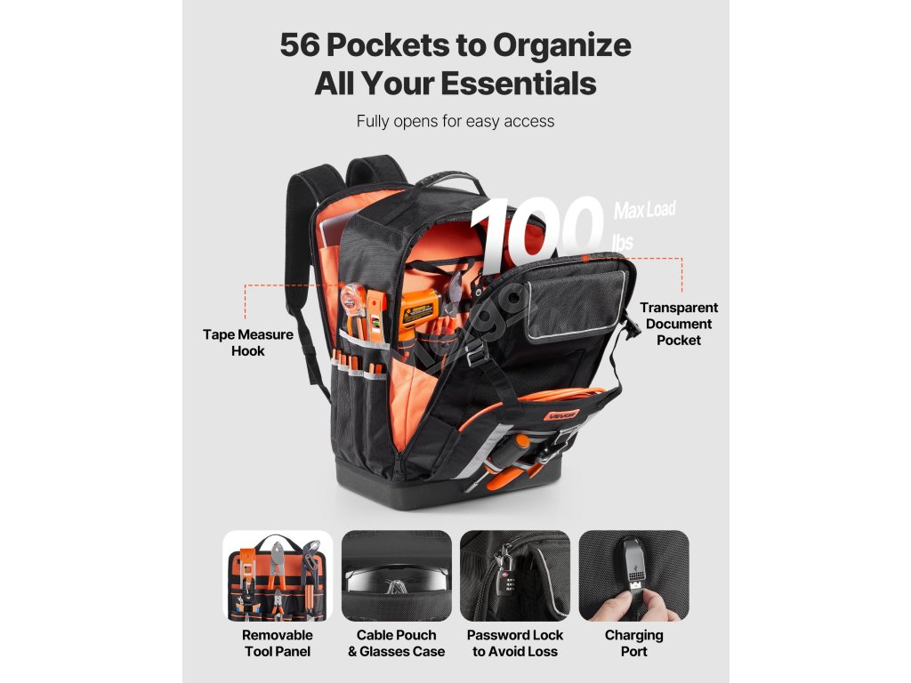 Tento batoh s 56 kapsami a měřícím hákem pomáhá uspořádat nářadí všech velikostí. Obsahuje dokonce i přihrádku na notebook a průhlednou kapsu pro zabezpečení vašich cenností, což z něj činí dokonalý nosič nářadí!