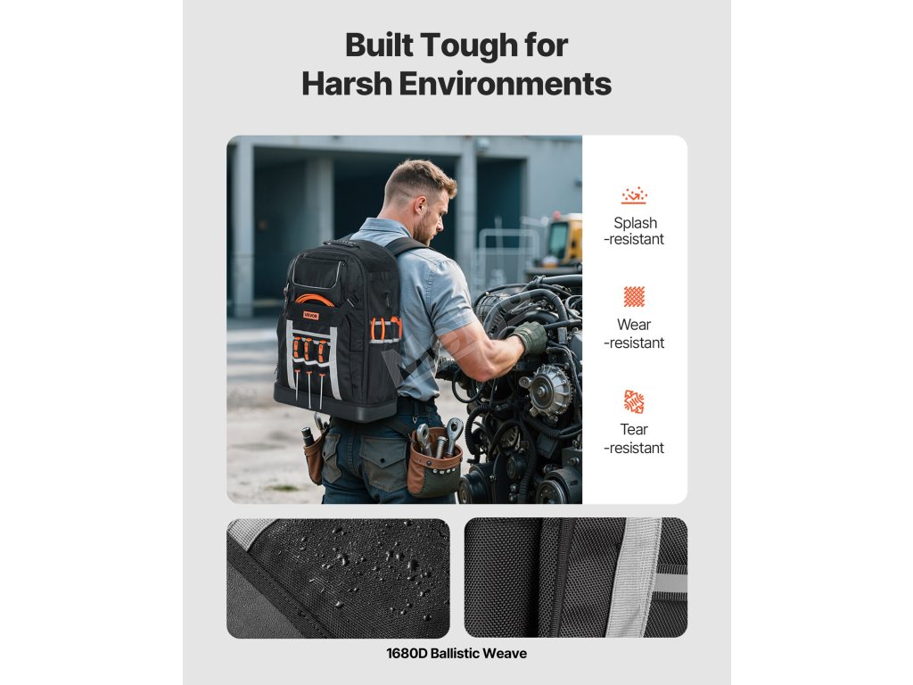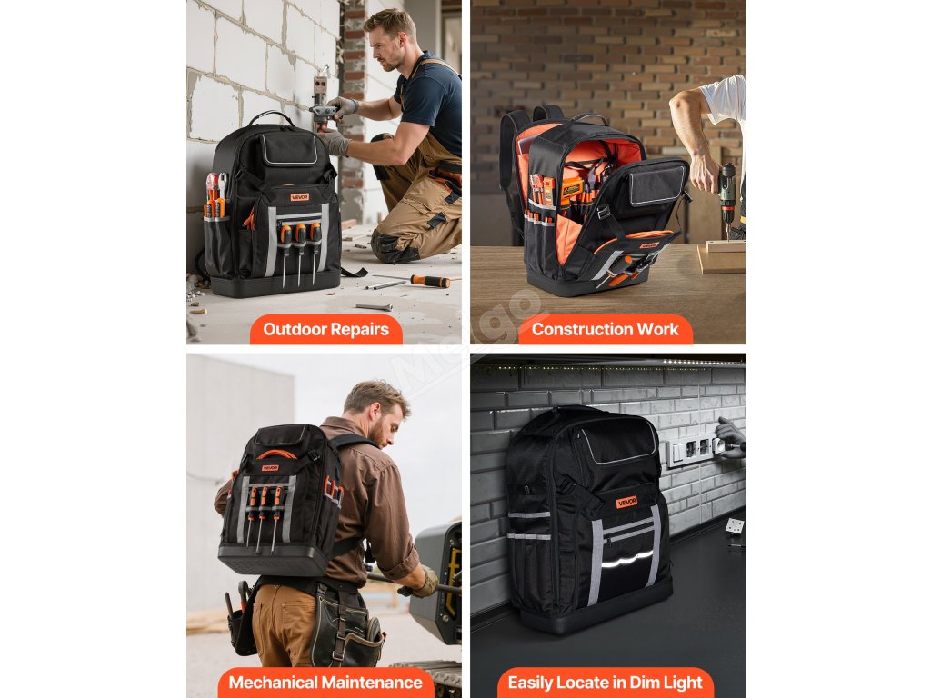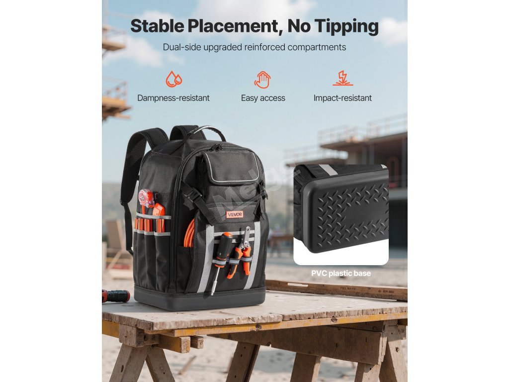 Tento batoh pro elektrikáře na staveništi je vyroben z odolné balistické tkaniny 1680D a je odolný proti roztržení a opotřebení. Dvouhlavý zip byl testován více než 20 000krát a základna z PVC zajišťuje stabilitu, takže se batoh nepřevrátí.