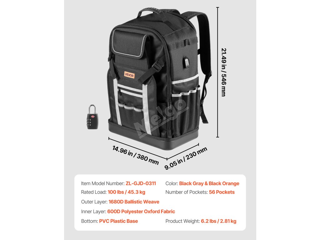 Odolný batoh na nářadí s nabíjecím portem: 56 kapes pro maximální úložný prostor
