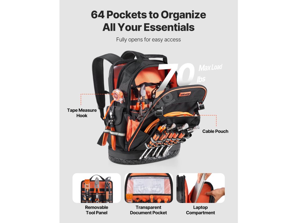 Tento batoh s 64 kapsami a měřícím hákem pomáhá uspořádat nářadí všech velikostí. Obsahuje dokonce i přihrádku na notebook a průhlednou kapsu pro zabezpečení vašich cenností, což z něj činí dokonalý nosič nářadí!