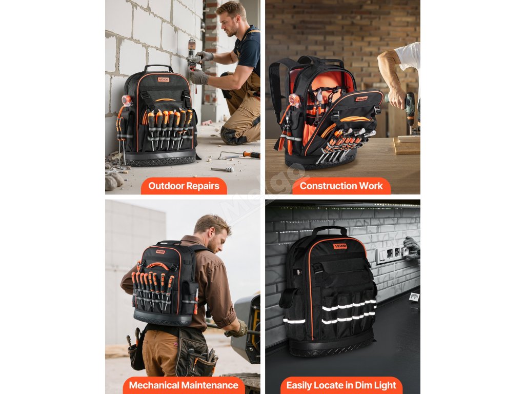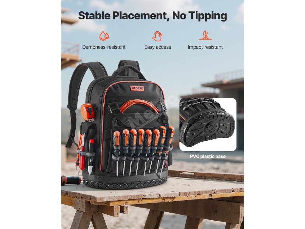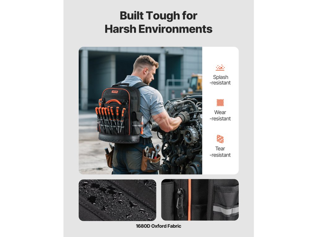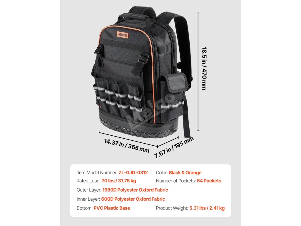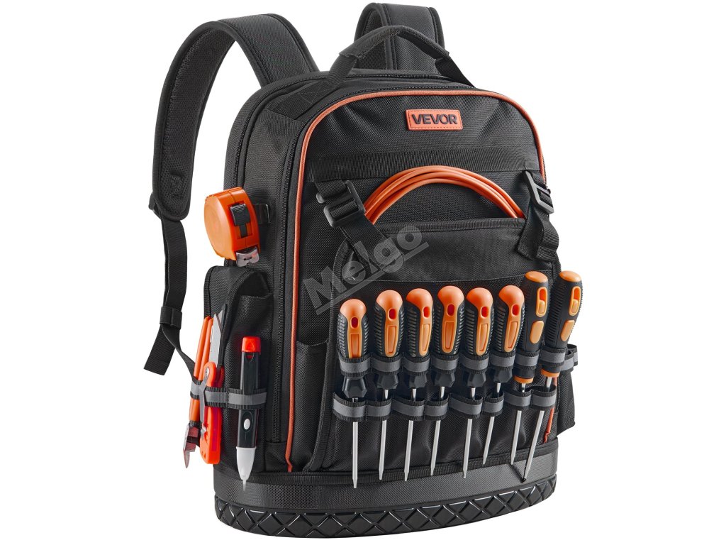 Tento batoh pro elektrikáře na staveništi je vyroben z odolné tkaniny 1680D Oxford a je odolný proti roztržení a opotřebení. Dvouhlavý zip byl testován více než 20 000krát a základna z PVC zajišťuje stabilitu, takže se batoh nepřevrátí.
