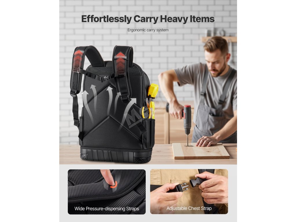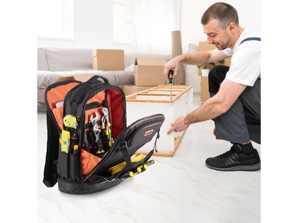Tento batoh s 65 kapsami a háčkem na svinovací metr pomáhá uspořádat nářadí všech velikostí. Obsahuje dokonce i přihrádku na notebook a průhlednou kapsu pro zabezpečení vašich cenností, což z něj činí dokonalý nosič nářadí!