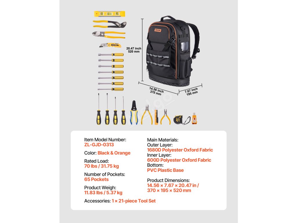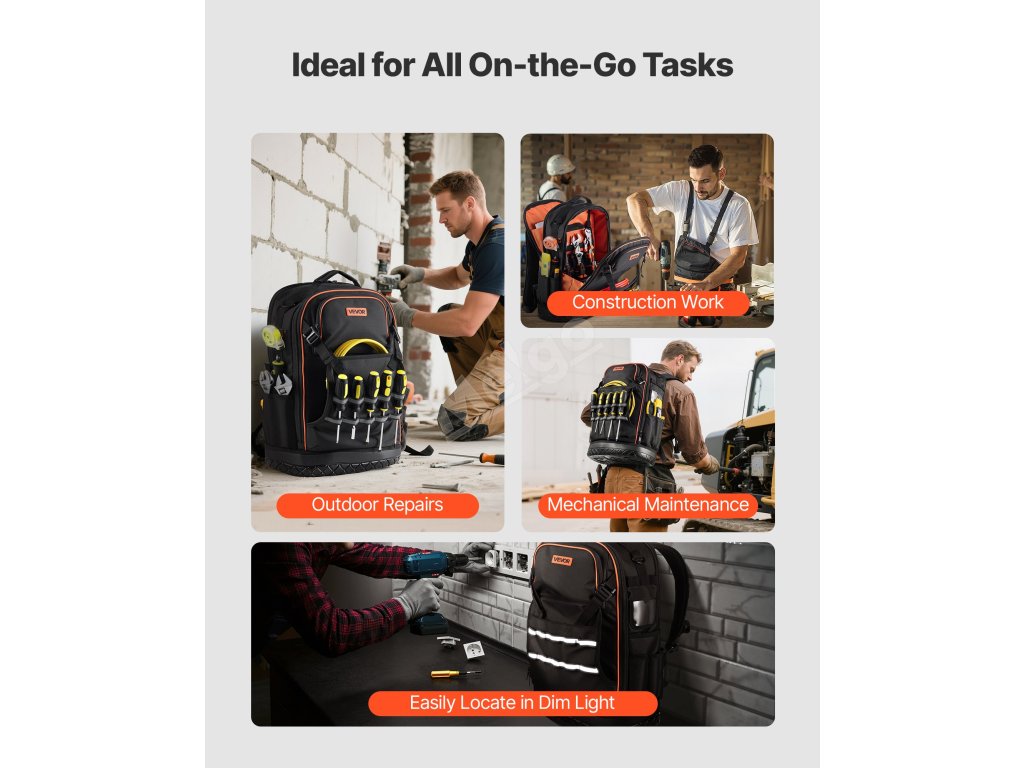 Tento batoh pro elektrikáře na staveništi je vyroben z odolné tkaniny 1680D Oxford a je odolný proti roztržení a opotřebení. Dvouhlavý zip byl testován více než 20 000krát a základna z PVC zajišťuje stabilitu, takže se batoh nepřevrátí.