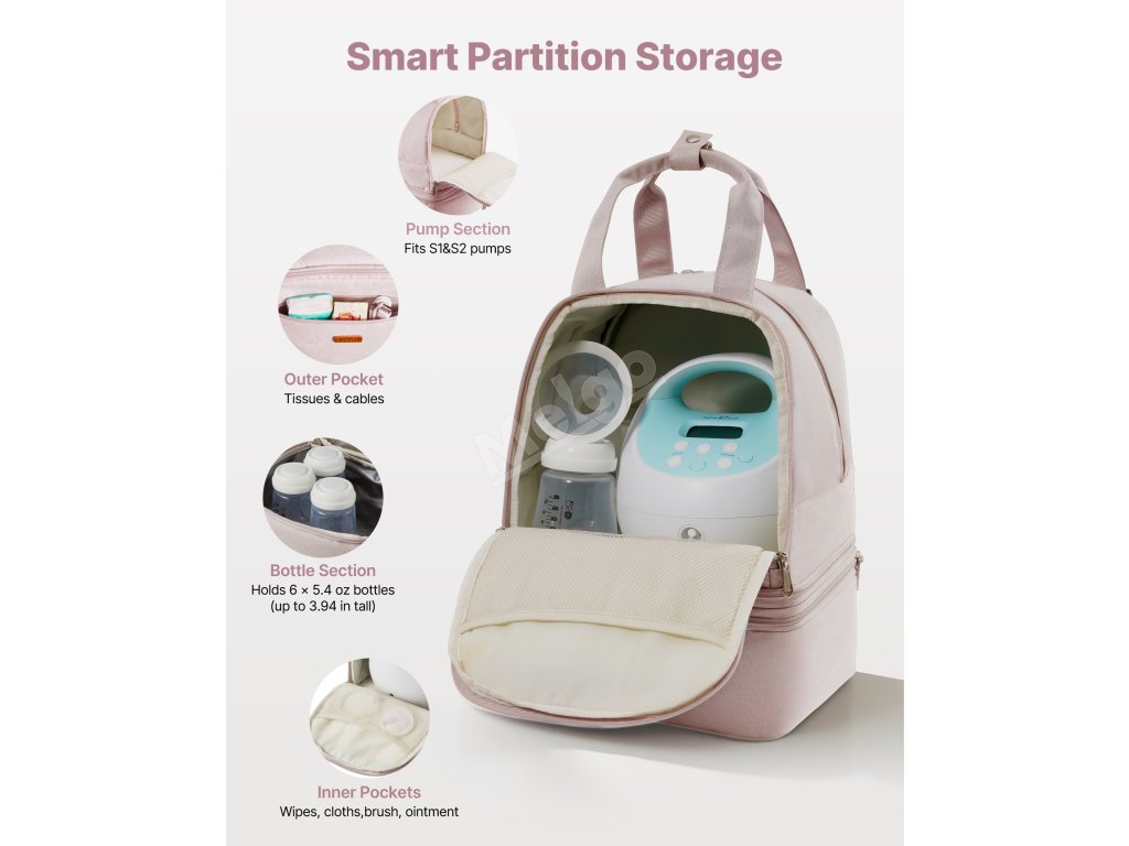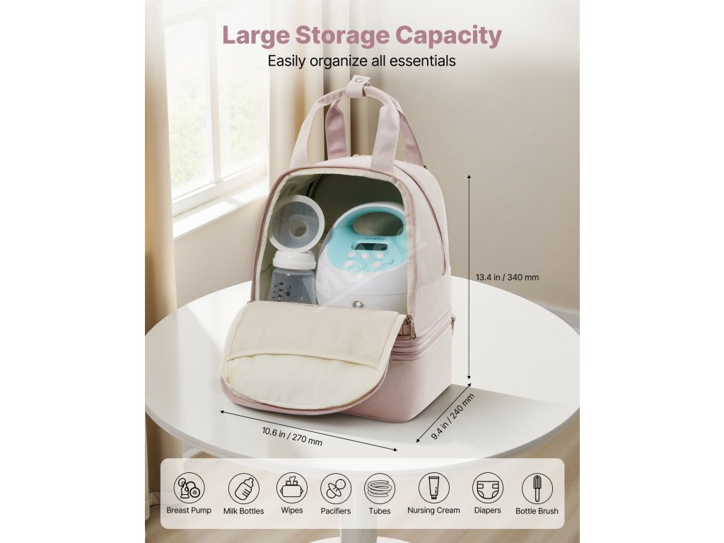 Kojicí taška obsahuje vnitřní a vnější kapsy na odsávačky mateřského mléka, lahve, pleny, ubrousky, zápisník a další věci. Do přední kapsy se vejdou nabíječky a zubní kartáčky, do bočních kapes kapes kapesníčky nebo šňůrky.