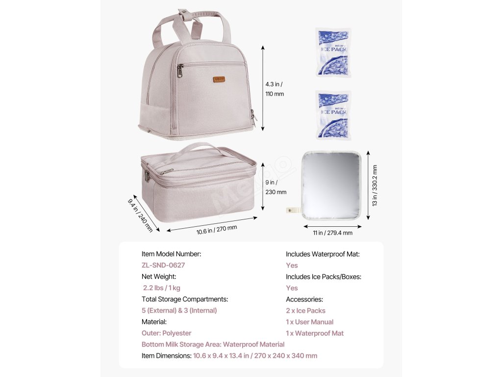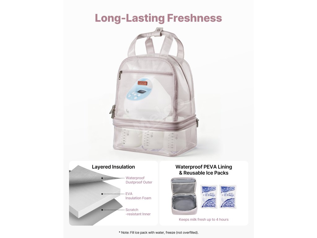 Prostor pro skladování mléka je vybaven vodotěsným materiálem se silnou izolací, která snižuje výměnu tepla s vnějším prostředím. Díky přiloženým sáčkům s ledem udrží naše cestovní taška na odsávačku mateřského mléka čerstvé až 4 hodiny.