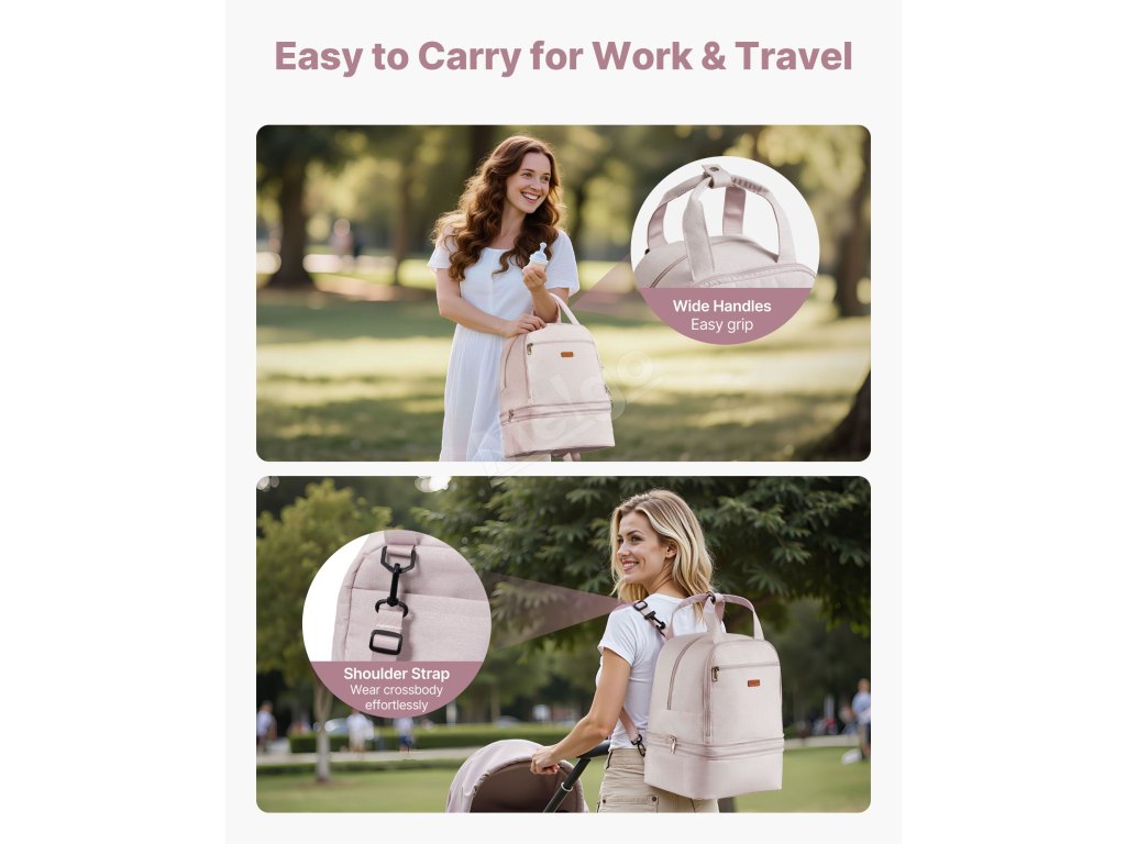 Široká rukojeť a polstrovaný popruh tašky pro uložení odsávačky mateřského mléka umožňují její pohodlné přenášení. Vodotěsná podložka pomáhá zabezpečit láhve před únikem. Snadno omyvatelná tkanina se rychle čistí a hladké zipy se snadno posouvají.