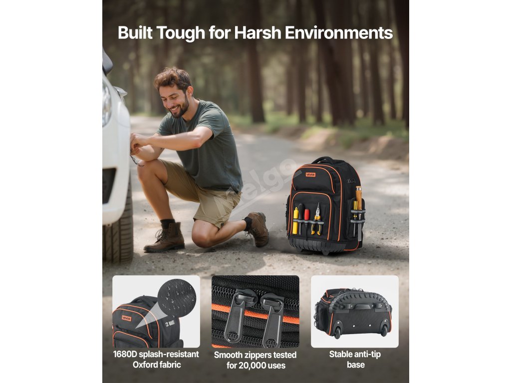 Tato pojízdná brašna na nářadí na kolečkách je vyrobena z odolné oxfordské tkaniny se zesíleným materiálem 1680D a vydrží i ty nejnáročnější práce. Její pevná základna a opěrné nožičky zabraňují převrácení a udržují vaše nářadí v pořádku a bezpečí.