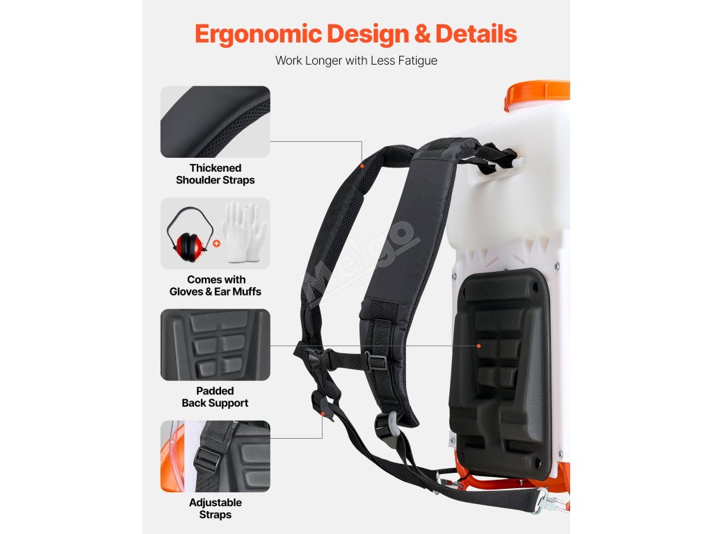 Dodává se s pracovními rukavicemi a chrániči sluchu, které pomáhají snižovat hluk a kontakt při dlouhém stříkání.
