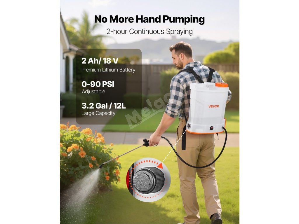 Zádový postřikovač s vyměnitelnou baterií 18 V 2Ah pro 2 hodiny provozu. Nastavitelný tlak 0-90 PSI a ergonomický design pro až 8 hodin pohodlného používání. Obsahuje 5 trysek a stříkací tyč na dva materiály pro více než 10 aplikací. Odolný proti úniku a snadno ovladatelný jednou rukou.