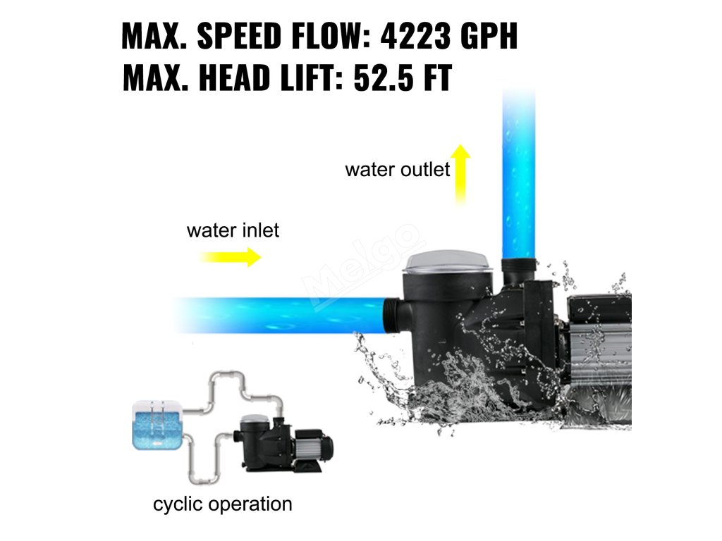 Bazénové čerpadlo je navrženo s účinným oběžným kolem, které zajišťuje vysoký průtok a vysoký výtlak. Max. Průtok: 19200 l/h (4223GPH); Max. Výška zdvihu: 52,5 ft/16 m.