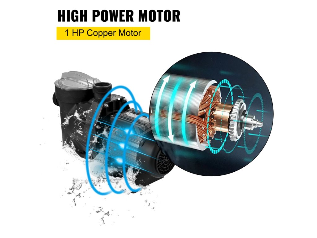 Bazénové čerpadlo je vybaveno výkonným a mimořádně účinným elektromotorem IP55 s příkonem 750 W a výkonem 1 HP. Bazénové čerpadlo do země používá motor z čisté mědi, aby bylo dosaženo stabilního výkonu a zajištěna dlouhá životnost.