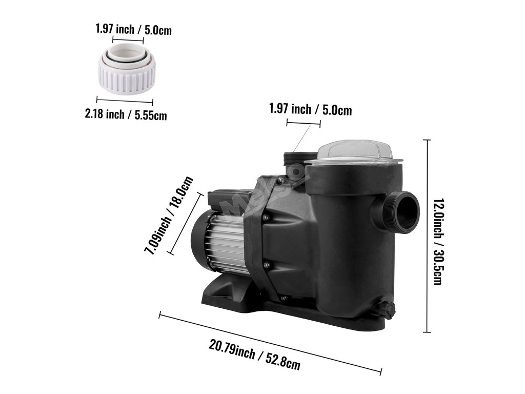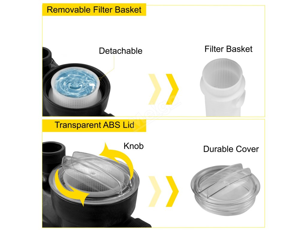 Bazénové čerpadlo o výkonu 1 HP má odnímatelný filtrační koš, který zajišťuje, že se do čerpadla nedostanou žádné nečistoty, čímž se prodlužuje jeho životnost. Průhledné víko umožňuje přehledný pohled dovnitř.