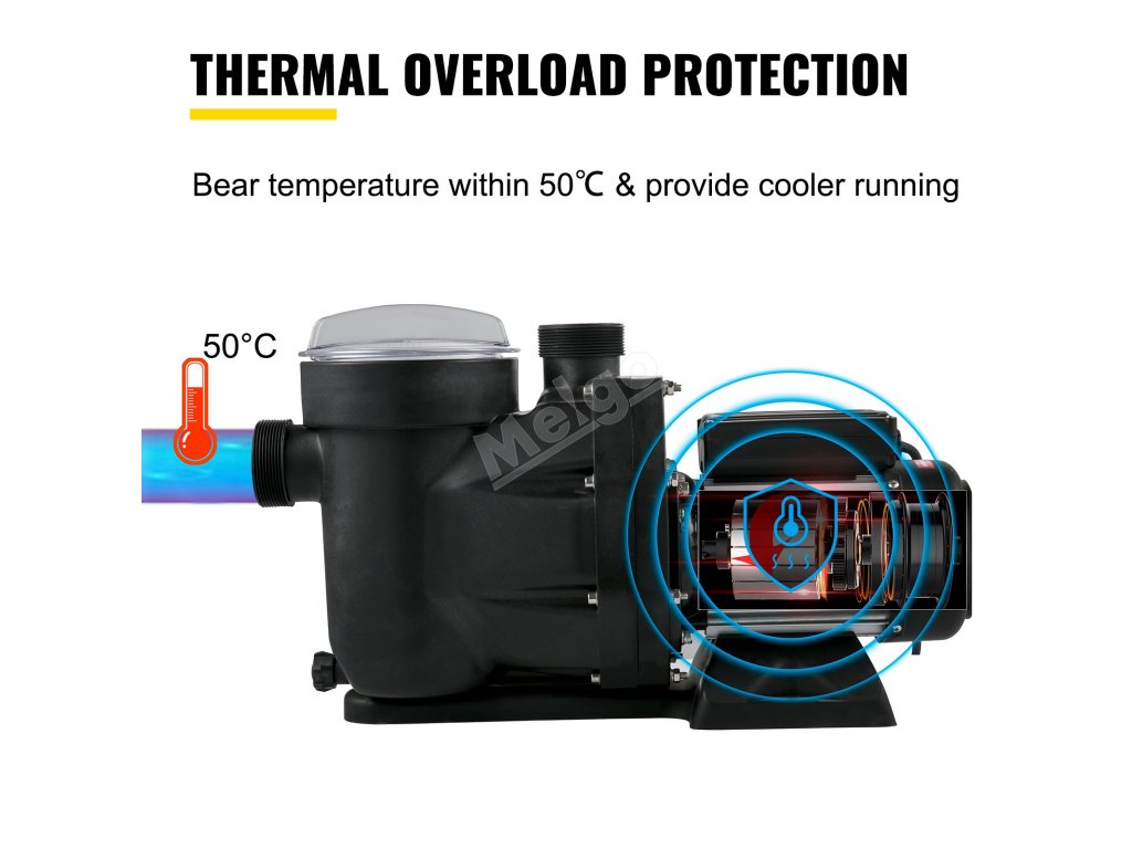 Motor bazénového čerpadla má zabudovanou tepelnou ochranu proti přetížení a tlakovou ochranu. Bazénové čerpadlo odolává teplotám mezi 122℉/50 ℃ a zajišťuje chladnější provoz.