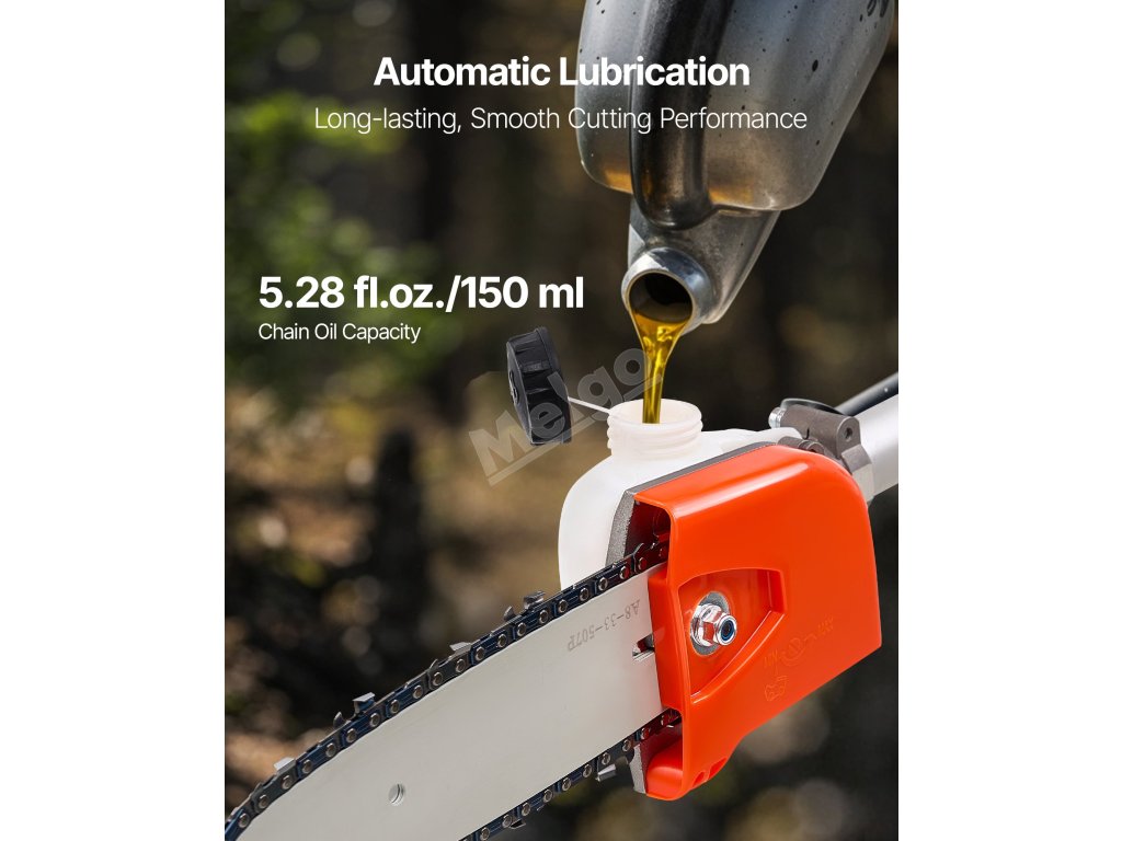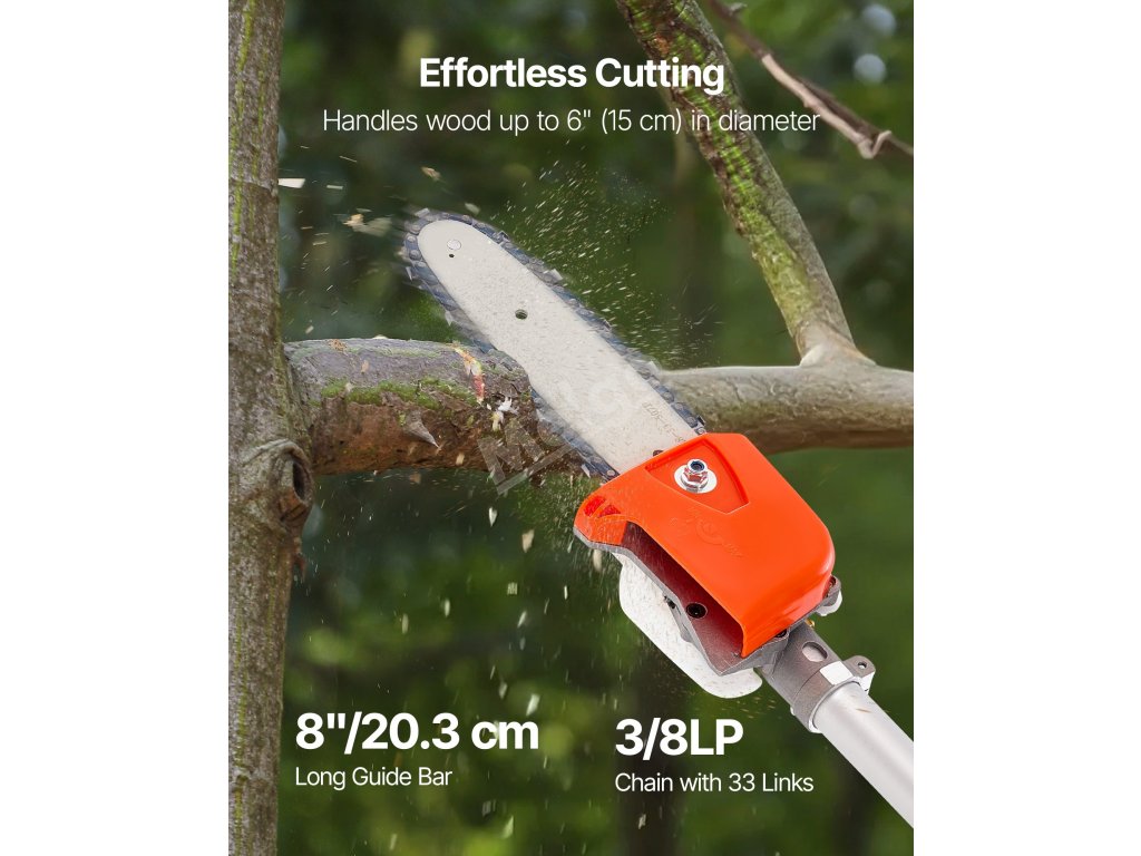 Plynová pila na tyče je vybavena dvoutaktním benzinovým motorem o objemu 25 cm3, který ve spojení s 8" (20,3cm) vodicí lištou poskytuje výkon 0,75 kW a až 12 000 otáček za minutu pro rychlé a efektivní řezání. Nemusíte se starat o délku kabelu nebo výdrž baterie, což zajišťuje vyšší efektivitu řezání a stabilní provoz.