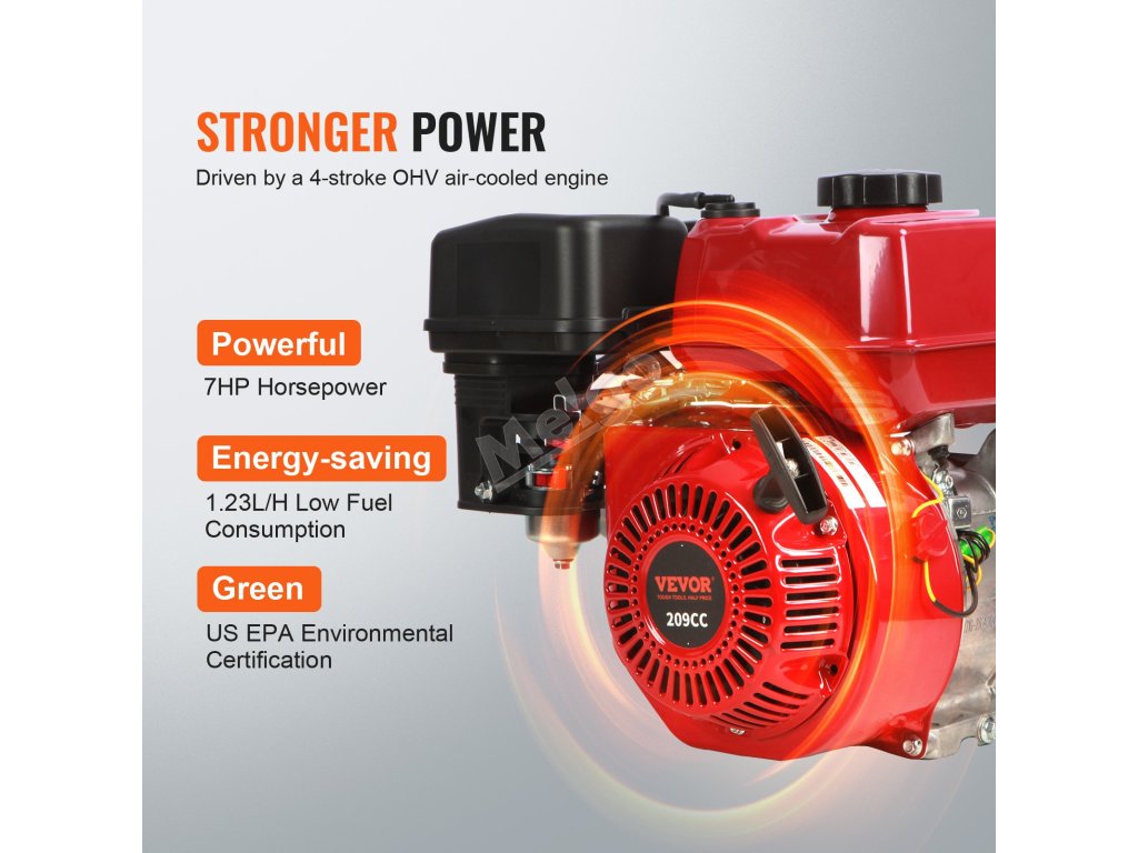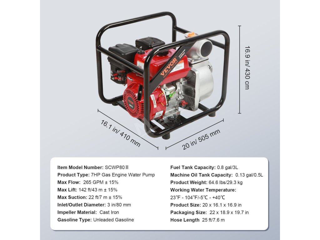 Naše čerpadlo se může pochlubit výkonným motorem o výkonu 7 HP, který zajišťuje průtok vody až 265 GPM s 3palcovým vstupem a výstupem. S maximálním zdvihem 142 stop a sáním 22 stop splní všechny vaše potřeby.