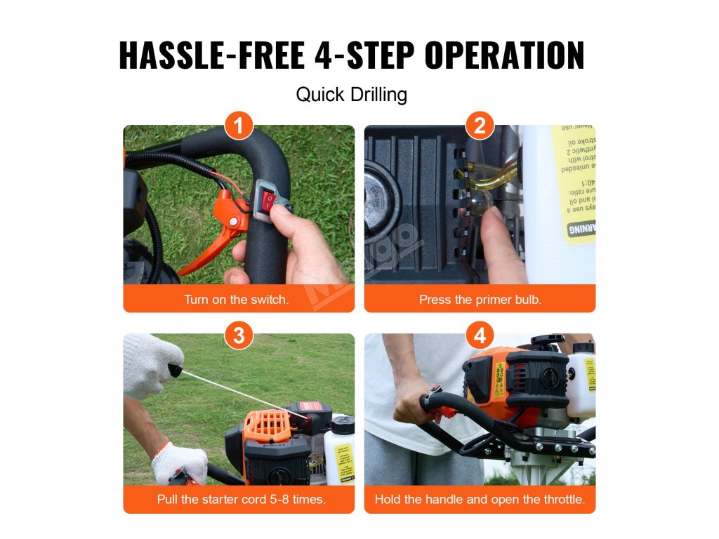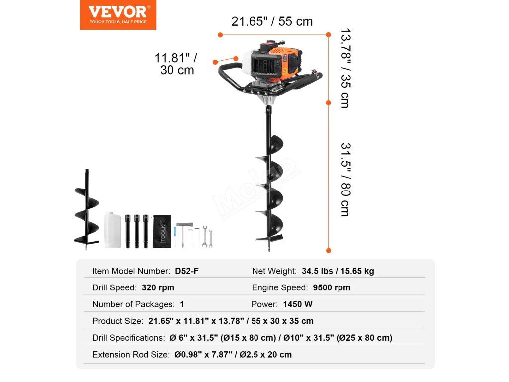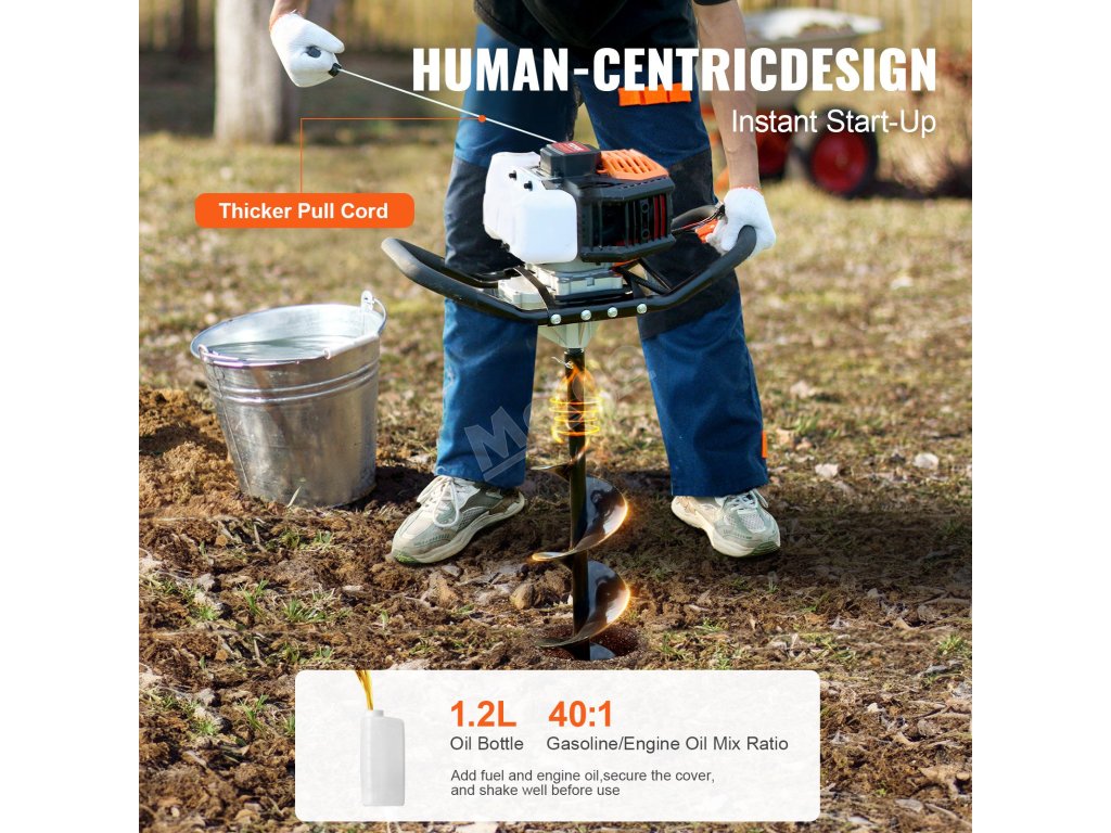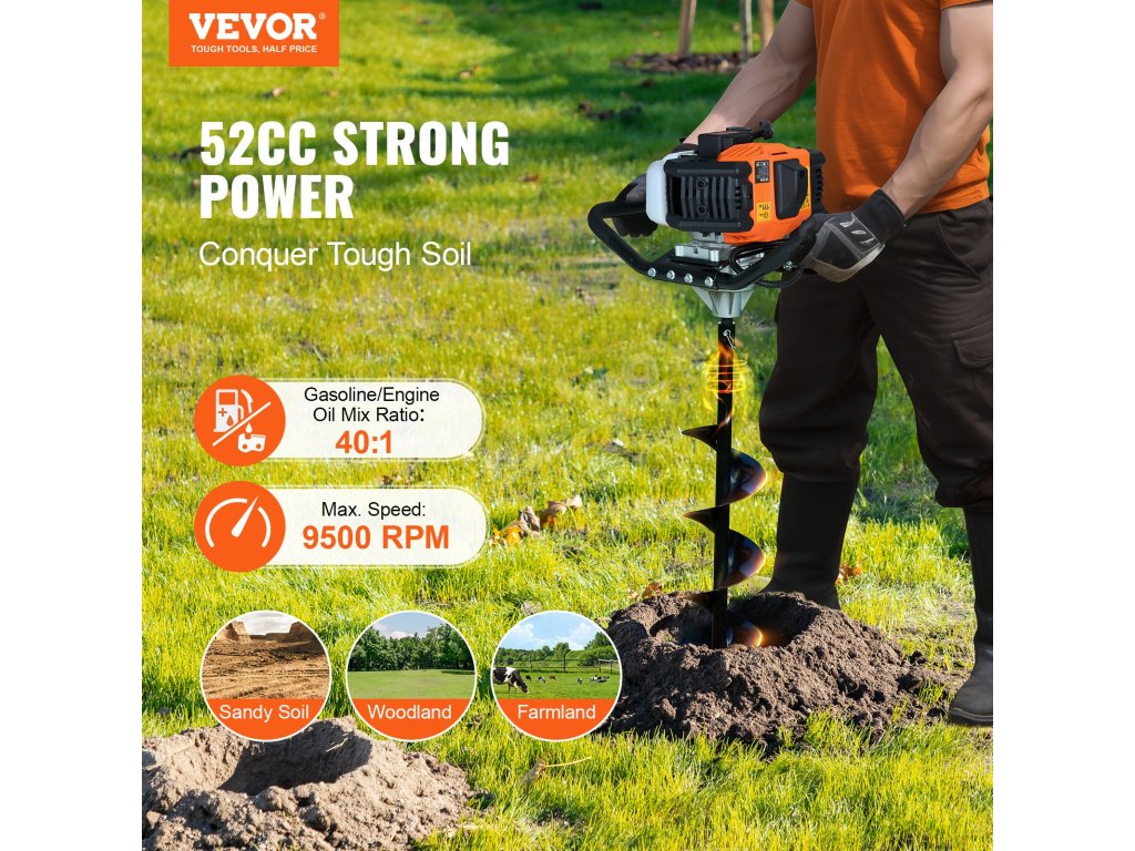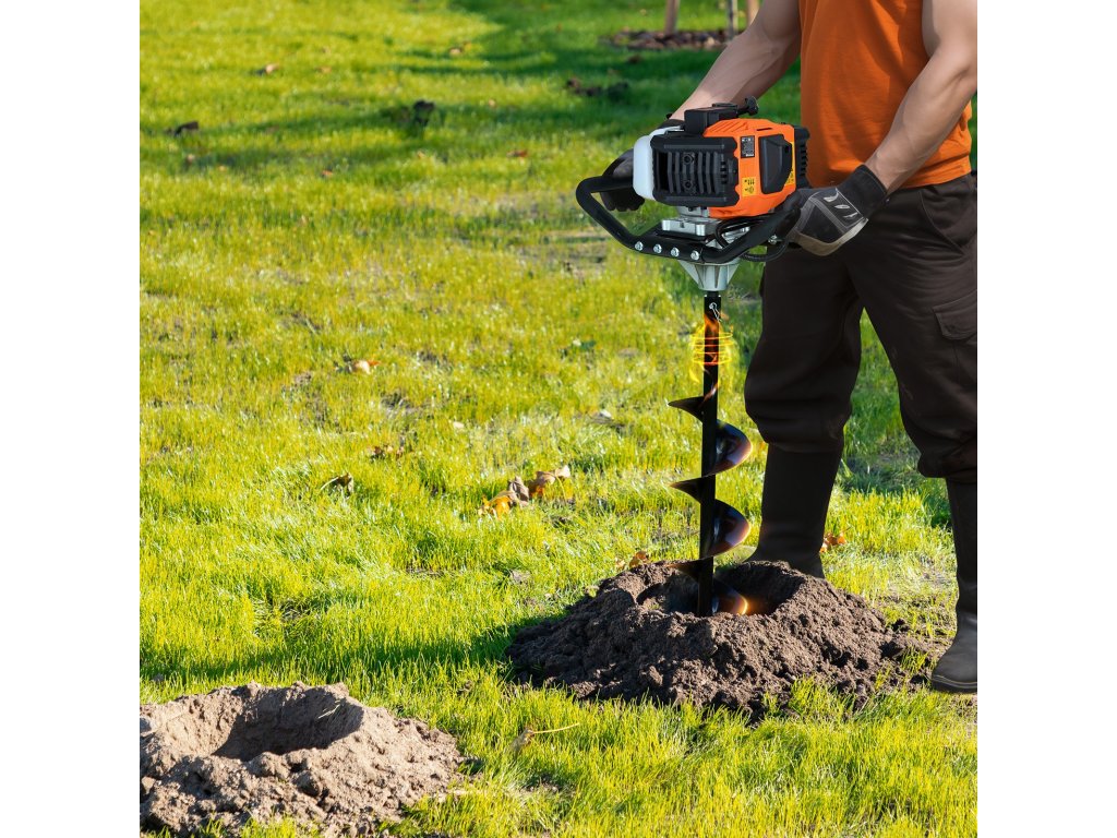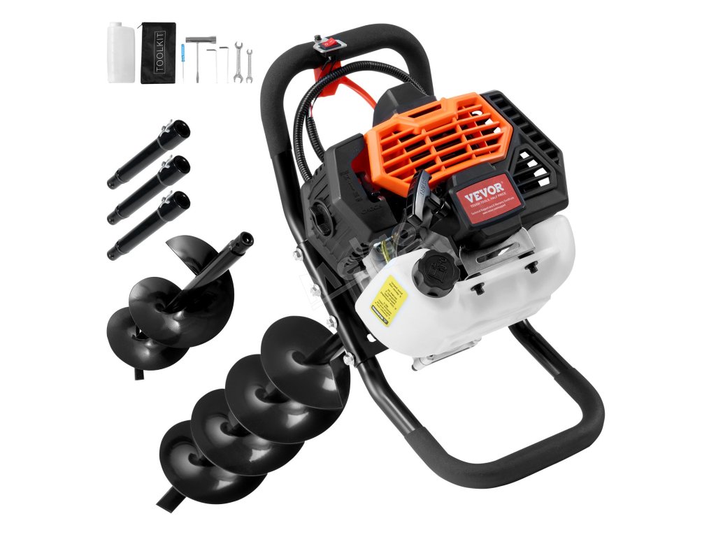 Benzínový zemní vrták 52cc 1450W, 6″ a 10″ vrtáky, 3 prodloužení