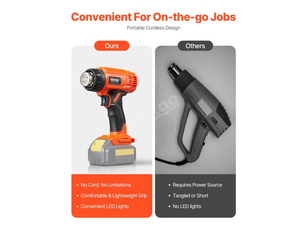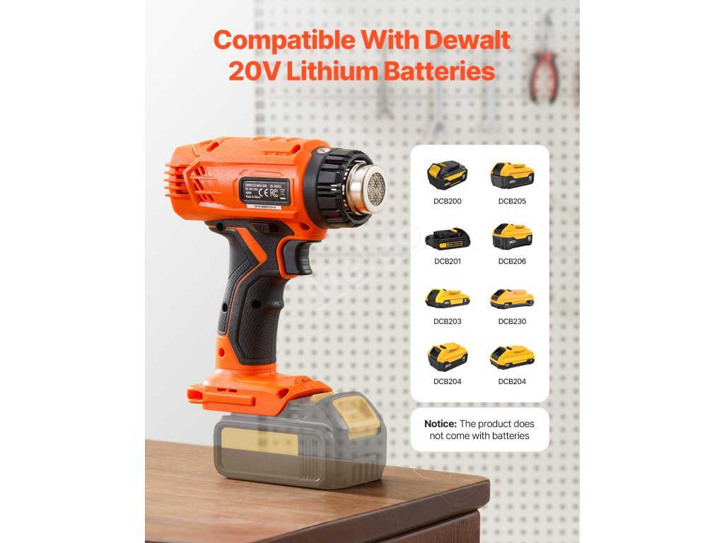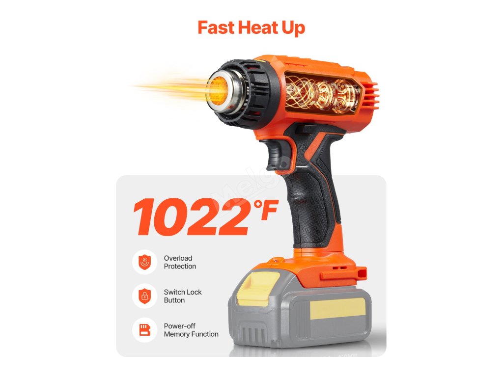 Táto bezdrôtová teplovzdušná pištoľ je vybavená výkonným motorom na rýchle zahrievanie. Zabudovaná funkcia ochrany proti nízkemu napätiu zabraňuje prehriatiu, čím zabezpečuje odolnosť a bezpečnosť. Spínač zámku vám uvoľní ruky, zatiaľ čo LED svetlo umožňuje jednoduchú obsluhu v tmavých a stiesnených priestoroch.