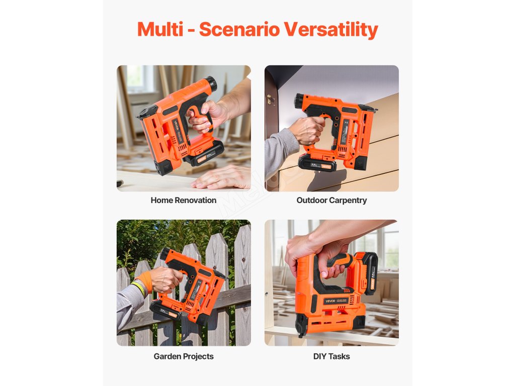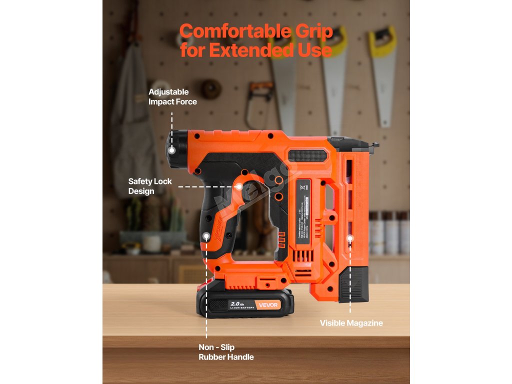 Tato akumulátorová hřebíkovačka 2 v 1 kombinuje hřebíkovačku a sponkovačku v jednom, bez kabelů, které by vás omezovaly v pohybu. Vezměte si ji kamkoli a snadno zvládněte různé upevňovací úkoly.