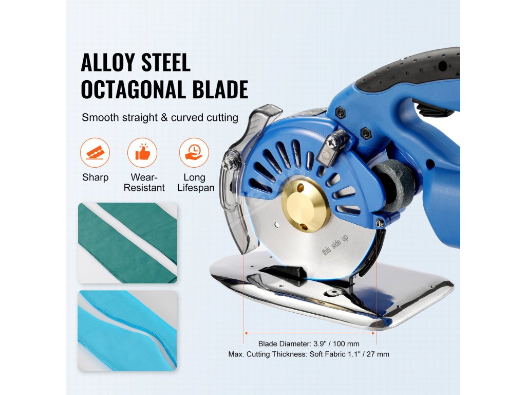 Tato elektrická řezačka látek je vybavena velkým 3,9"/100mm osmihranným ostřím z odolné legované oceli, které zaručuje ostrost a odolnost proti opotřebení. Dokáže řezat až 1,1"/27 mm pružné látky, aniž by se čepel rozštípla, a to i při zakřivených řezech.