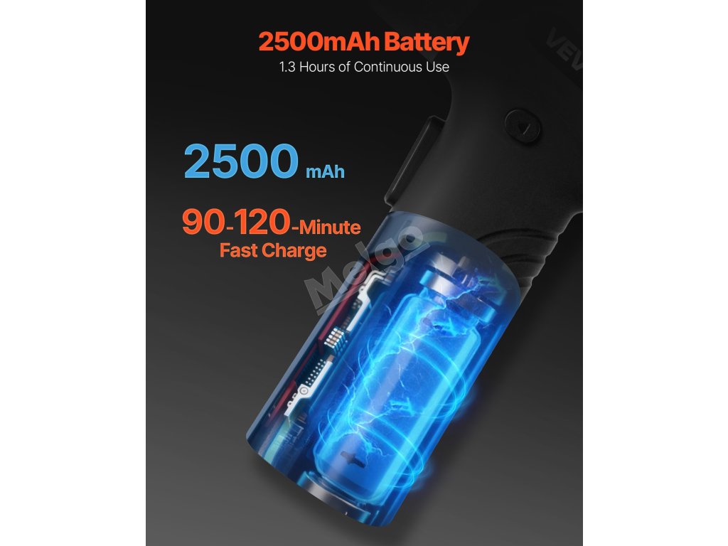 Tento akumulátorový šroubovák je napájen baterií s kapacitou 2500 mAh a na jedno nabití vydrží pracovat až 50 minut. Díky pokročilému portu pro rychlé nabíjení typu C trvá dosažení plného výkonu pouhých 90-120 minut, což minimalizuje prostoje a udržuje vaši práci v chodu.