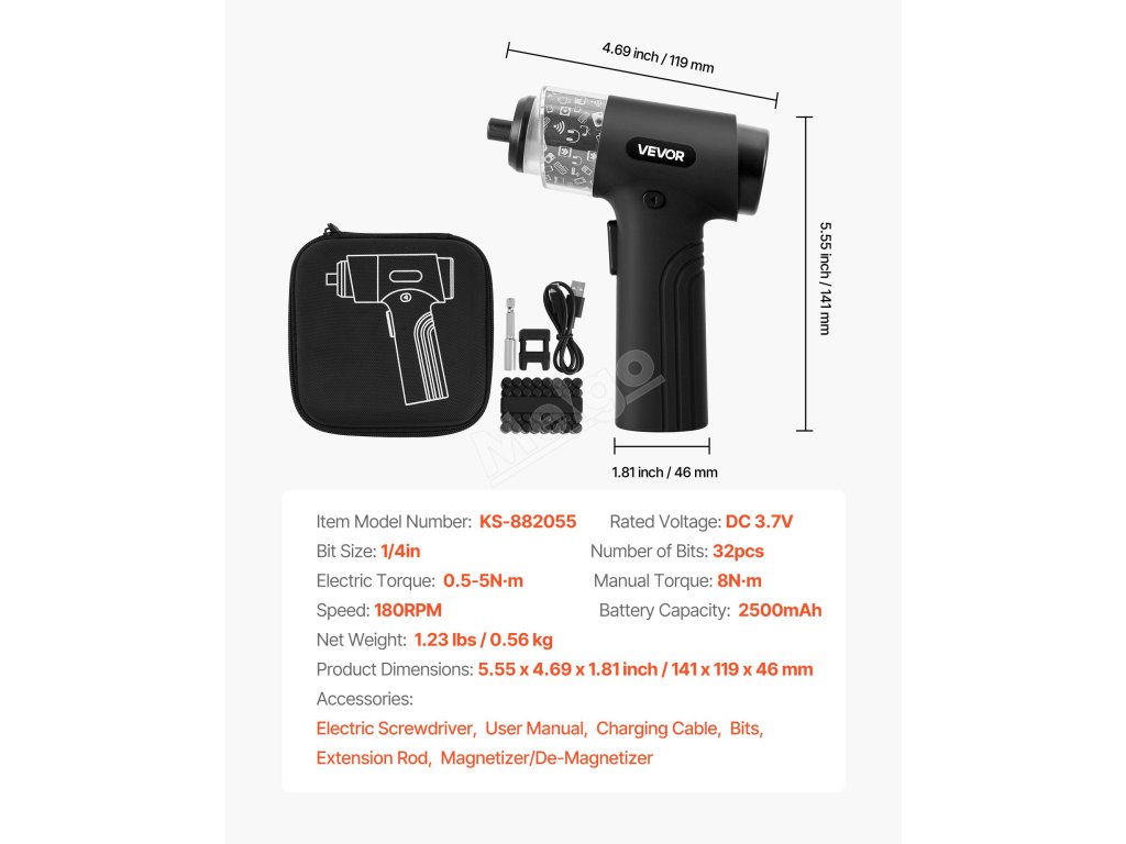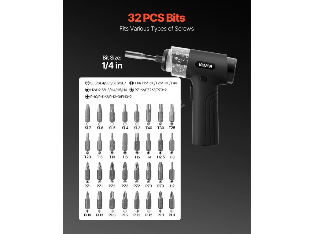 Tento elektrický šroubovák je vybaven 32 vyměnitelnými bity a nastavitelným rozsahem krouticího momentu 0,5-5 N-m a snadno zvládá různé úkoly. Jemná regulace krouticího momentu vám pomůže přesně utáhnout šrouby, aniž byste to přehnali, ať už pracujete na spotřebičích, nábytku nebo pomůckách.