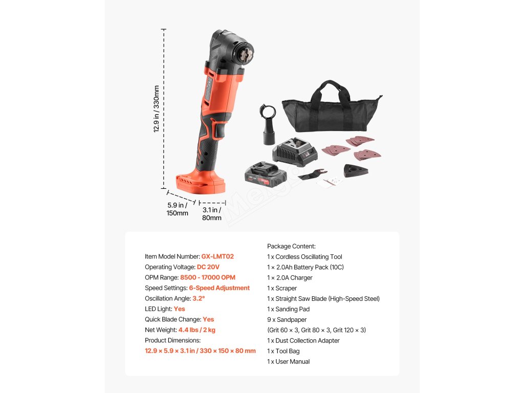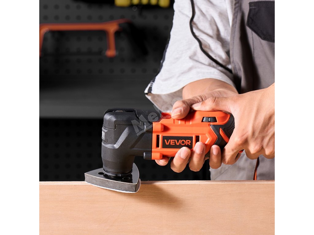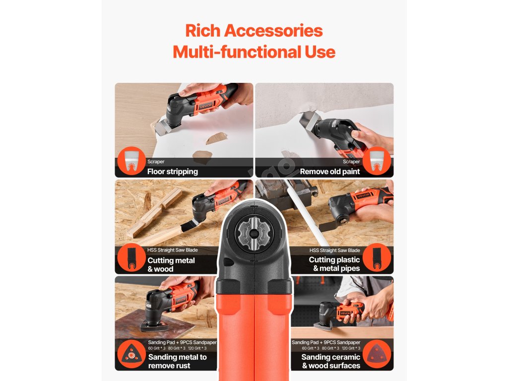 Akumulátorové oscilační nářadí VEVOR 20V se dodává s různým příslušenstvím pro pily, které snadno zvládne broušení, řezání, škrábání a další úkoly. Má 6 rychlostí od 8 500 do 17 000 OPM, rychlou výměnu pilového kotouče, 2,0Ah akumulátor a nabíječku - ideální pro domácí kutily, práci se dřevem a kutilské projekty.