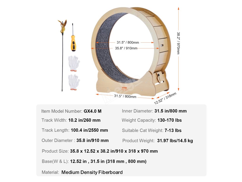 Toto kolečko na cvičení koček je vyrobeno z masivního dřeva, což zaručuje jeho dlouhou životnost. Díky prostorné 12,6palcové základně poskytuje vaší kočce stabilní prostor pro cvičení. Jedinečná konstrukce s mezerou 0,2"/6 mm zajišťuje bezpečnost a umožňuje vašemu kočičímu společníkovi volně běhat po kolečku.