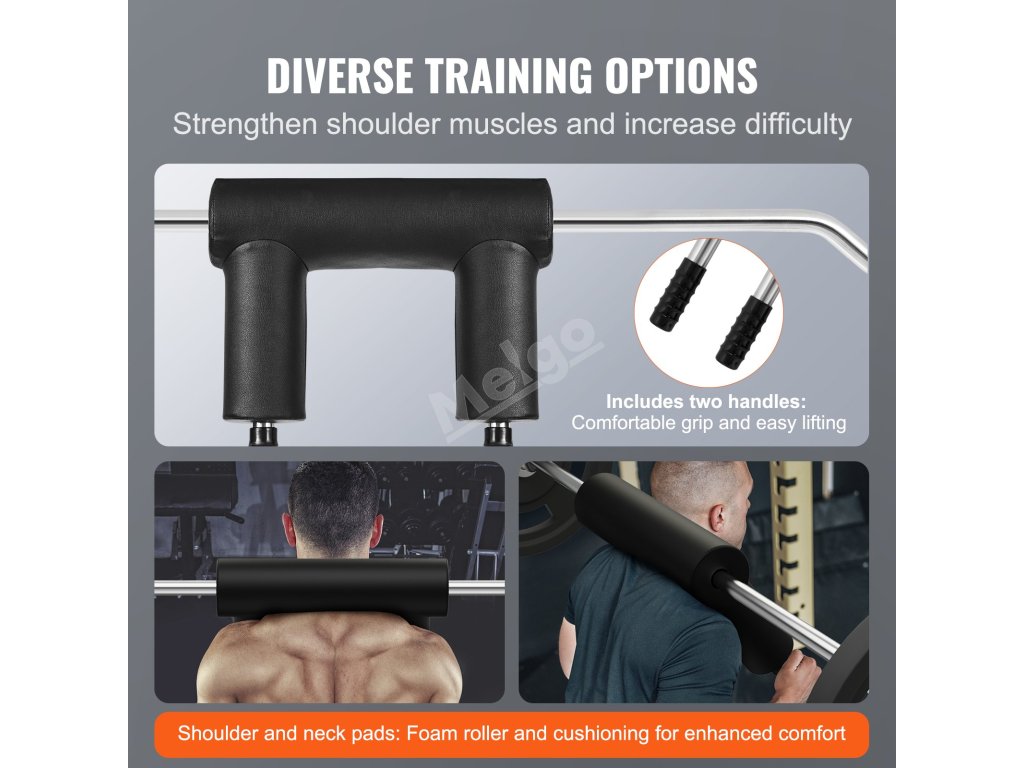 Oblasti ramen a krku našeho dřepovacího zařízení jsou vybaveny pěnovým polstrováním navrženým tak, aby vyrovnávalo sílu ramen a zpestřovalo váš trénink.