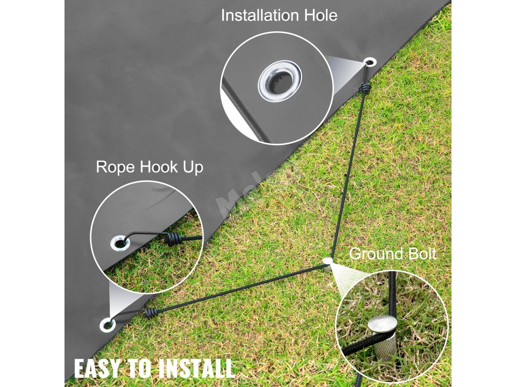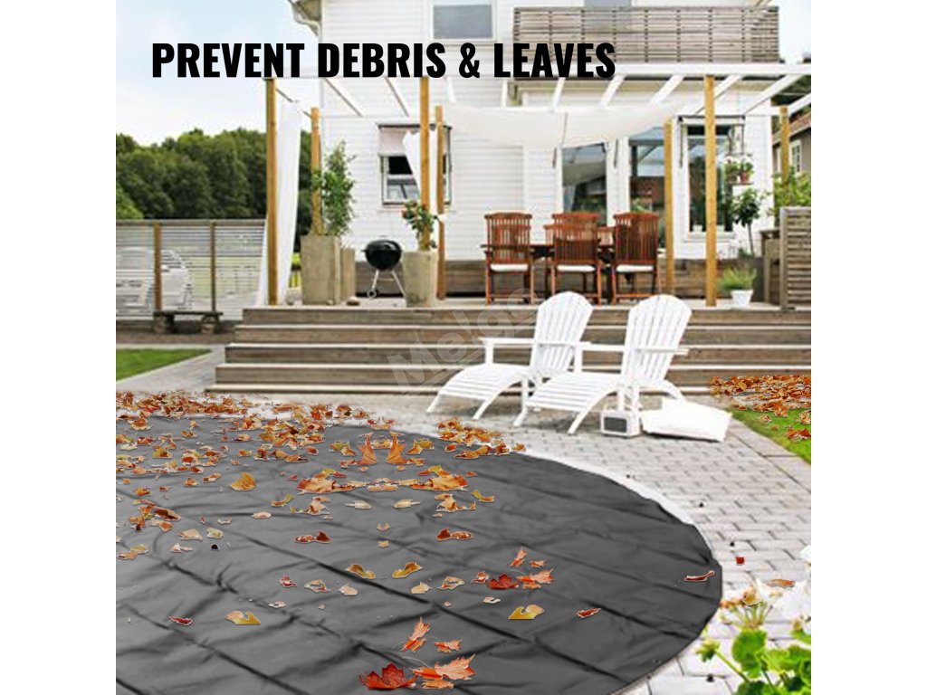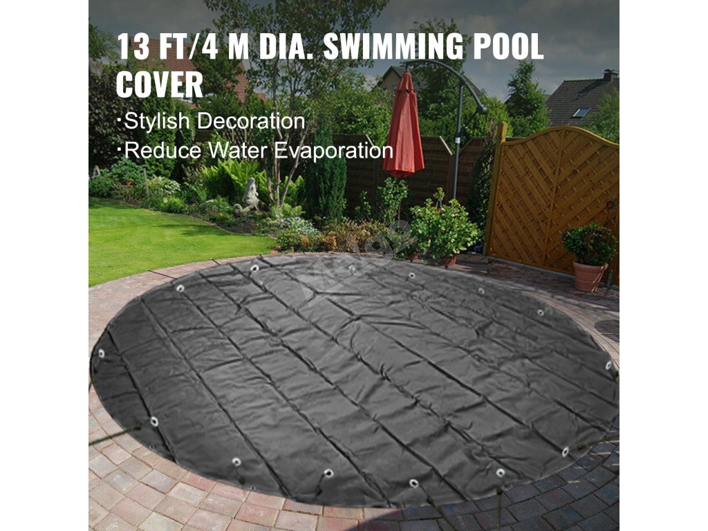 Krycí plachta na bazén v zemi má průměr 13 stop a hodí se pro bazén o průměru 12 stop. Nemá žádné těžkopádné háčky a očka pro snadné použití.