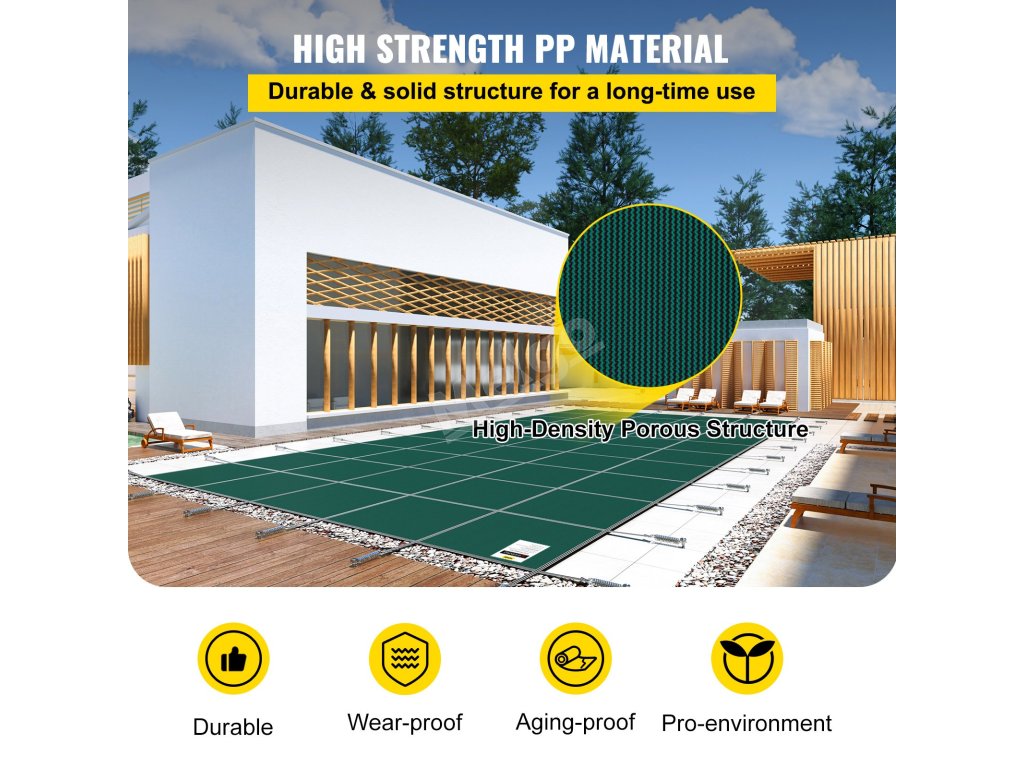 Bezpečnostný kryt bazéna VEVOR sme navrhli tak, aby poskytoval maximálnu bezpečnosť a pokoj. Zaručuje, že váš bazén zostane v bezpečí a chránený pred nečistotami, lístím a inými prvkami. Tento kryt tvorí vysokokvalitný polypropylén, ktorý je pevný a zároveň má dlhú životnosť. Pevný sieťovaný povrch zabraňuje náhodným pádom a udržiava priestor vášho bazéna bezpečný pre deti a domáce zvieratá. Bezpečné uchytenie a robustné mosadzné zemné skrutky poskytujú dodatočnú stabilitu. Tento bezpečnostný kryt je ideálny na udržiavanie čistého a bezpečného prostredia bazéna počas celého roka.