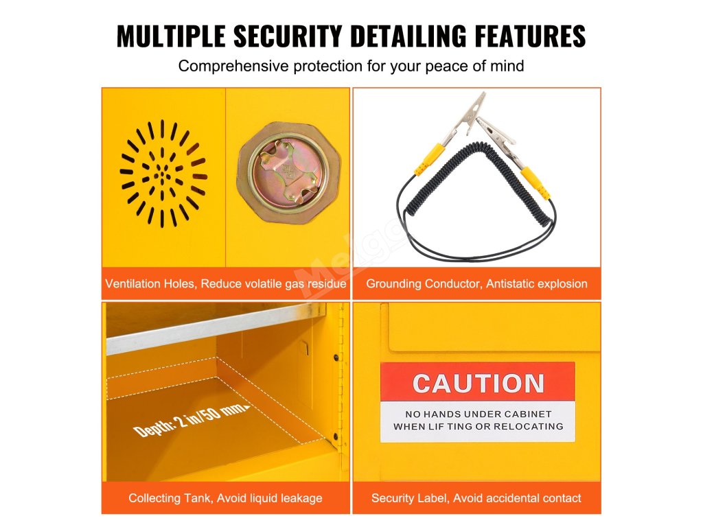 Představujeme vám naši bezpečnostní skříňku na hořlavé kapaliny, která je vyrobena z oceli Q235 válcované za studena pro dlouhou životnost. Je navržena s větracími otvory, uzemňovacím vodičem a sběrnou nádrží, přičemž splňuje normy NFPA Code 30 schválené FM a OSHA. Bezpečnost je naší prioritou a my se o vás postaráme!
